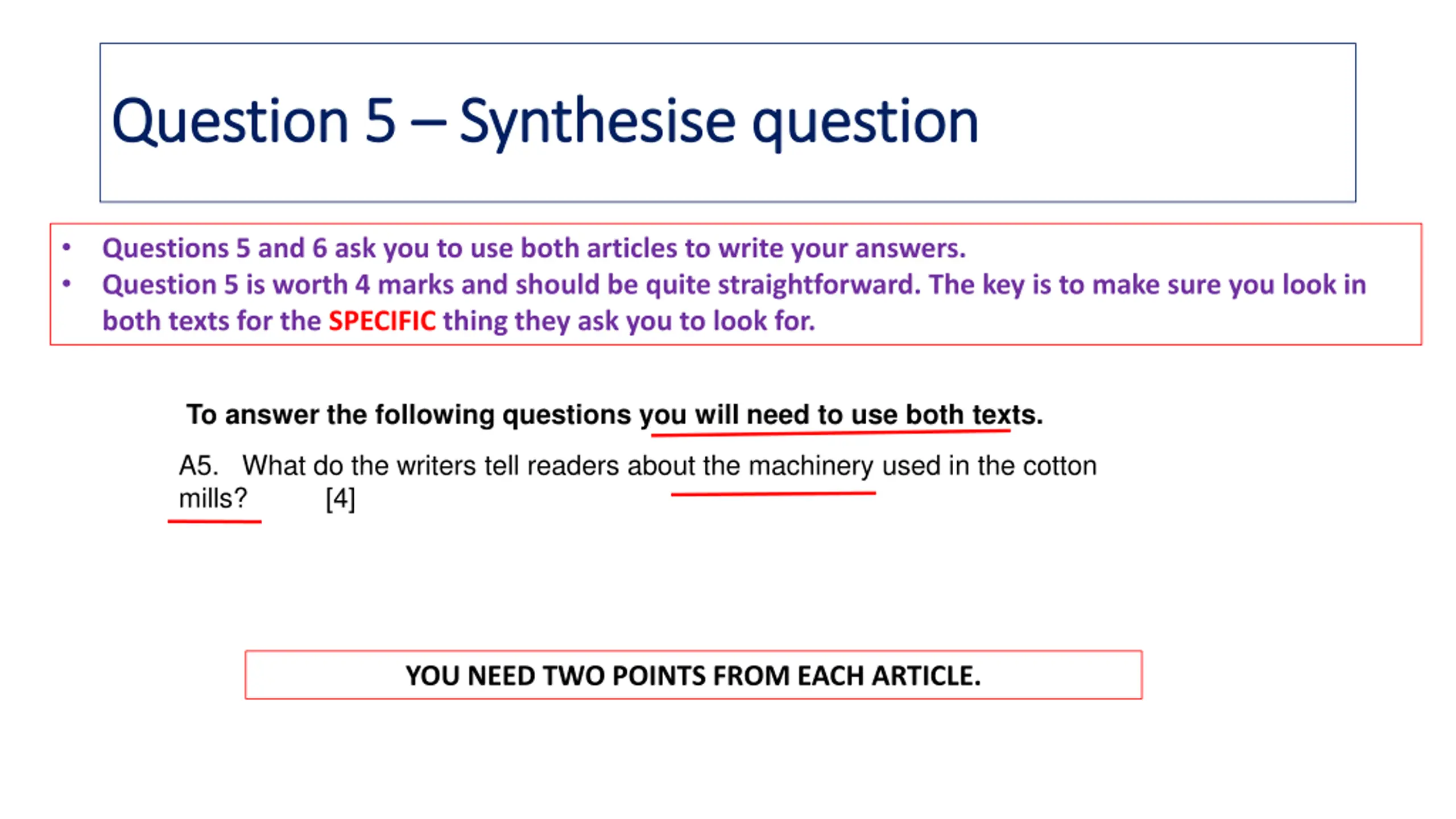 Question 5 Question 5 Synthesise question Synthesise question Questions 5 and 6 ask you to use both articles to write your answers. Question 5 is worth 4 marks and should be quite straightforward. The key is to make sure you look in both texts for the SPECIFIC thing they ask you to look for. To answer the following questions you will need to use both texts. A5. What do the writers tell readers about the machinery used in the cotton mills? [4] YOU NEED TWO POINTS FROM EACH ARTICLE.