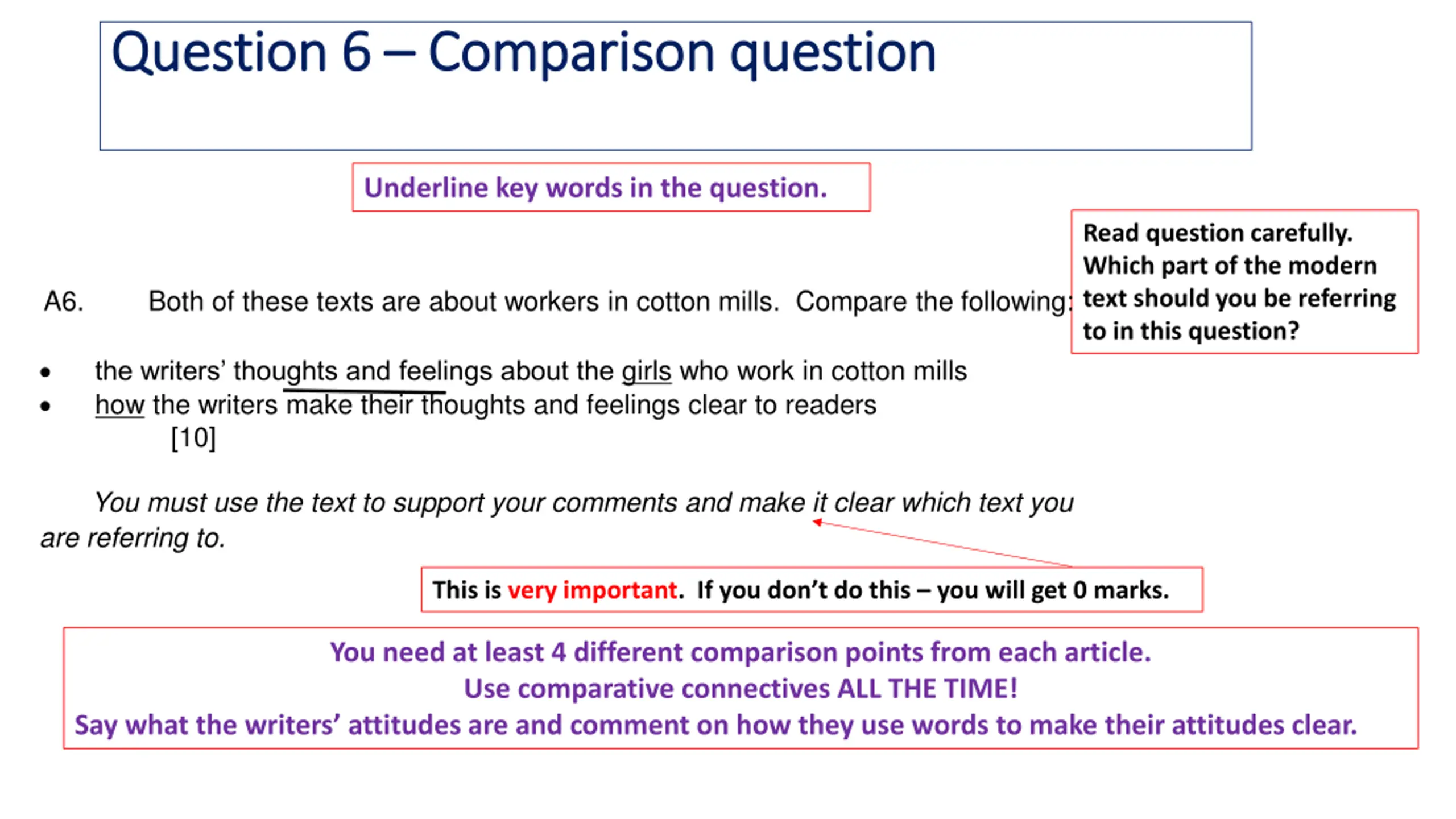 Question 6 Question 6 Comparison question Comparison question Underline key words in the question. Read question carefully. Which part of the modern text should you be referring to in this question? A6. Both of these texts are about workers in cotton mills. Compare the following: the writers thoughts and feelings about the girls who work in cotton mills how the writers make their thoughts and feelings clear to readers [10] You must use the text to support your comments and make it clear which text you are referring to. This is very important. If you don t do this you will get 0 marks. You need at least 4 different comparison points from each article. Use comparative connectives ALL THE TIME! Say what the writers attitudes are and comment on how they use words to make their attitudes clear.