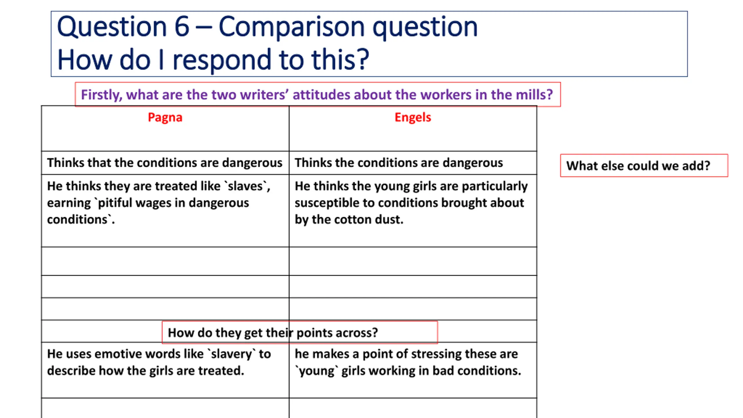 Question 6 Question 6 Comparison question Comparison question How do I respond to this? How do I respond to this? Firstly, what are the two writers attitudes about the workers in the mills? Pagna Engels Thinks that the conditions are dangerous Thinks the conditions are dangerous What else could we add? He thinks they are treated like `slaves`, earning `pitiful wages in dangerous conditions`. He thinks the young girls are particularly susceptible to conditions brought about by the cotton dust. How do they get their points across? He uses emotive words like `slavery` to describe how the girls are treated. he makes a point of stressing these are `young` girls working in bad conditions.