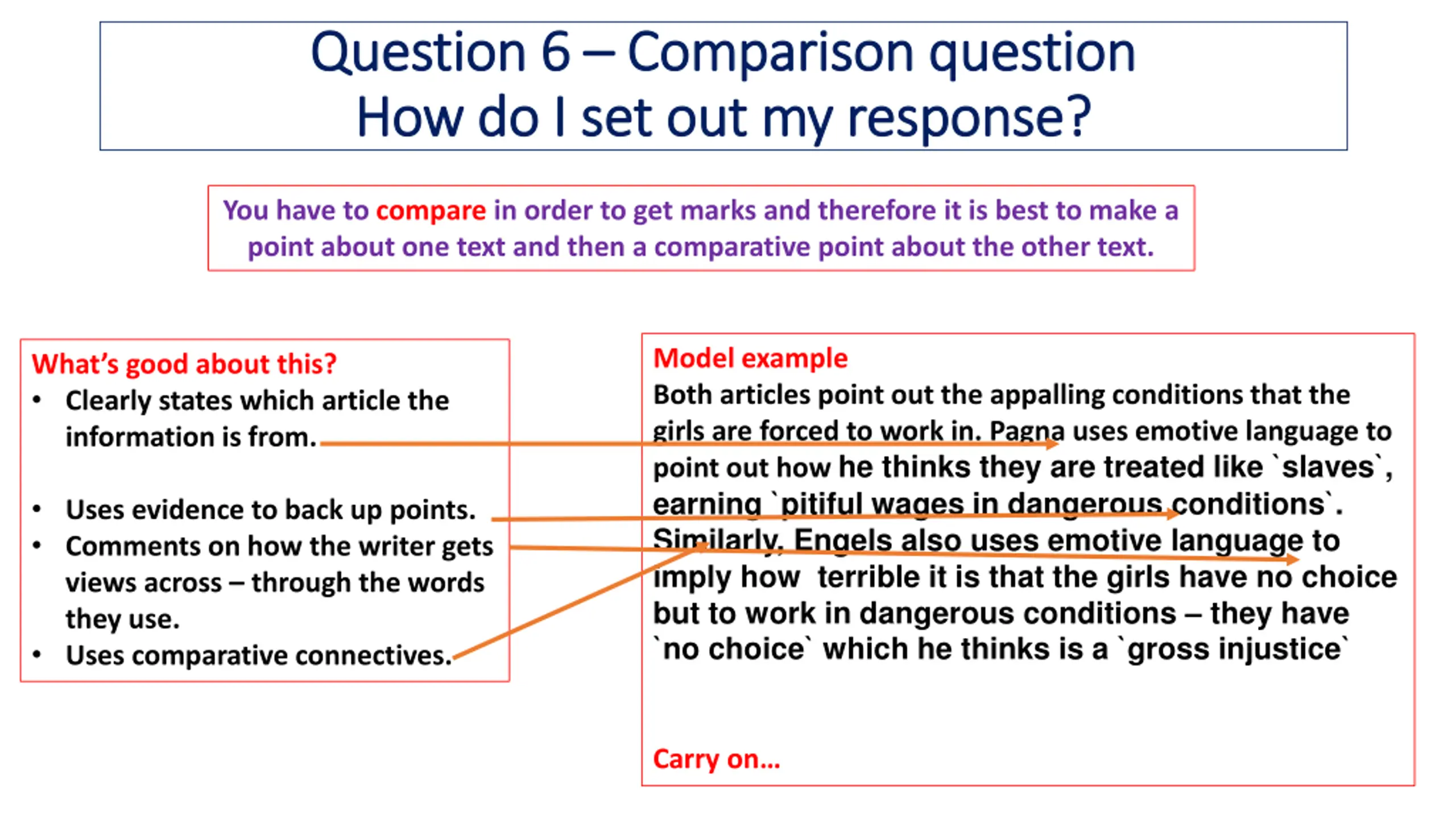 Question 6 Question 6 Comparison question Comparison question How do I set out my response? How do I set out my response? You have to compare in order to get marks and therefore it is best to make a point about one text and then a comparative point about the other text. Model example Both articles point out the appalling conditions that the girls are forced to work in. Pagna uses emotive language to point out how he thinks they are treated like `slaves`, earning `pitiful wages in dangerous conditions`. Similarly, Engels also uses emotive language to imply how terrible it is that the girls have no choice but to work in dangerous conditions they have `no choice` which he thinks is a `gross injustice` What s good about this? Clearly states which article the information is from. Uses evidence to back up points. Comments on how the writer gets views across through the words they use. Uses comparative connectives. Carry on