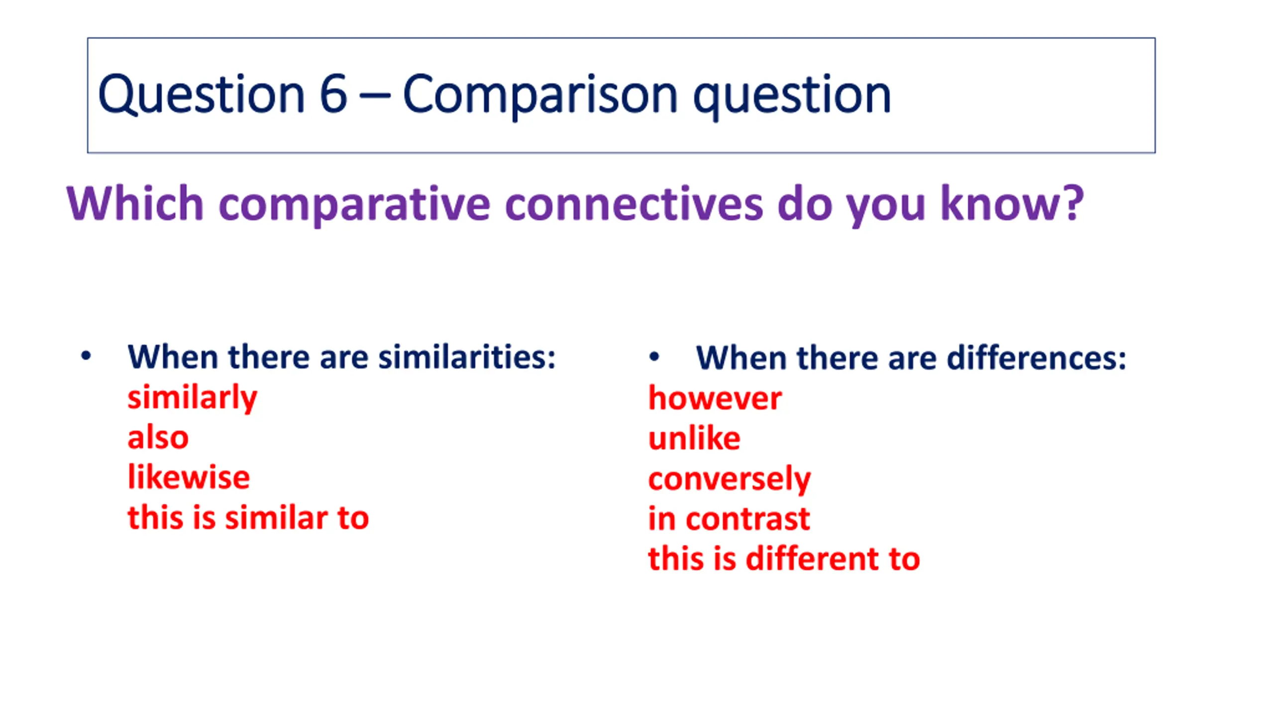 Question 6 Question 6 Comparison question Comparison question Which comparative connectives do you know? however unlike conversely in contrast this is different to When there are similarities: similarly also likewise this is similar to When there are differences:
