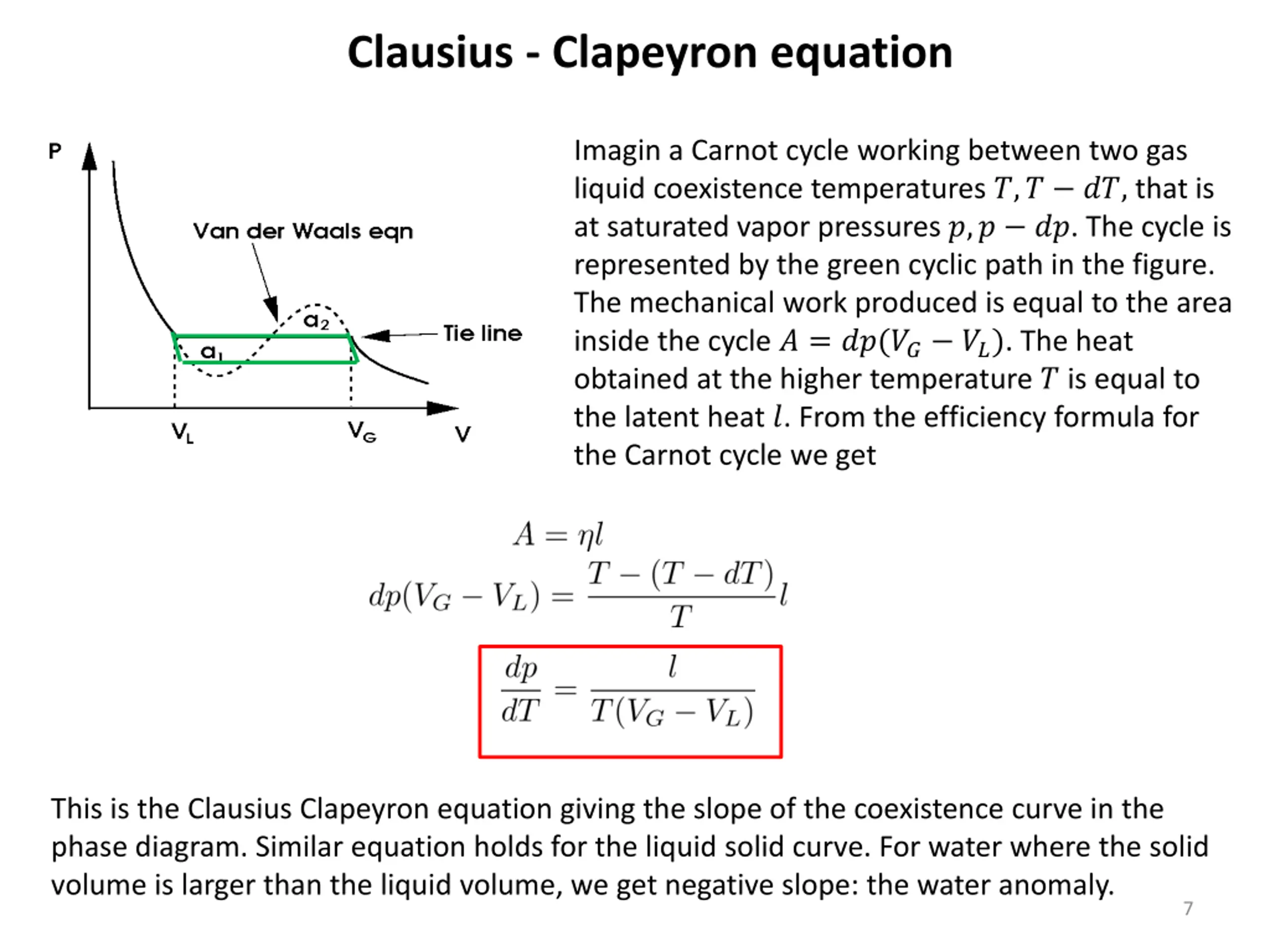 Clausius - Clapeyron equation Imagin a Carnot cycle working between two gas liquid coexistence temperatures ?,? ??, that is at saturated vapor pressures ?,? ??. The cycle is represented by the green cyclic path in the figure. The mechanical work produced is equal to the area inside the cycle ? = ??(?? ??). The heat obtained at the higher temperature ? is equal to the latent heat ?. From the efficiency formula for the Carnot cycle we get This is the Clausius Clapeyron equation giving the slope of the coexistence curve in the phase diagram. Similar equation holds for the liquid solid curve. For water where the solid volume is larger than the liquid volume, we get negative slope: the water anomaly. 7