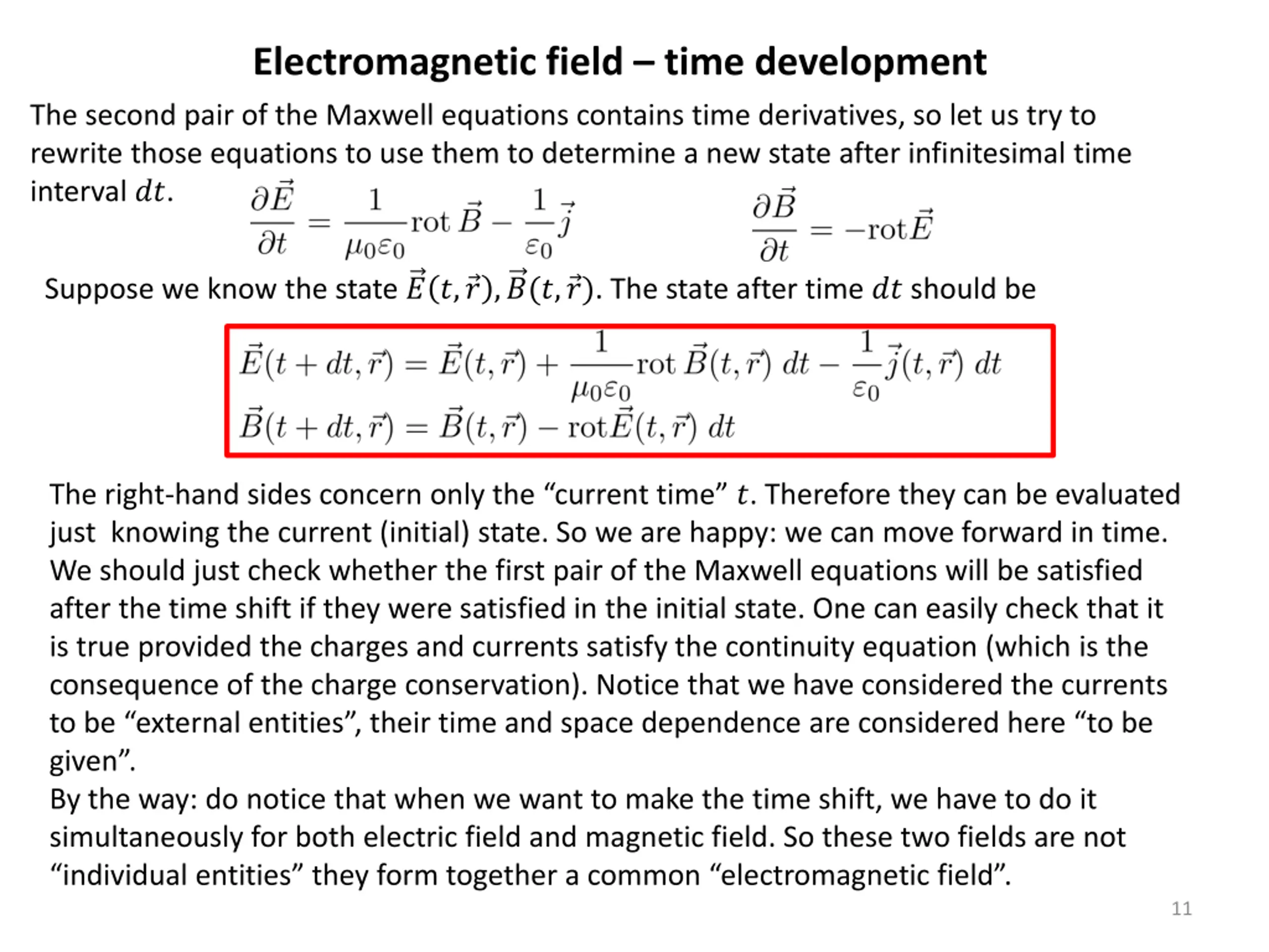 Electromagnetic field time development The second pair of the Maxwell equations contains time derivatives, so let us try to rewrite those equations to use them to determine a new state after infinitesimal time interval ??. Suppose we know the state ? ?, ? ,?(?, ?). The state after time ?? should be The right-hand sides concern only the current time ?. Therefore they can be evaluated just knowing the current (initial) state. So we are happy: we can move forward in time. We should just check whether the first pair of the Maxwell equations will be satisfied after the time shift if they were satisfied in the initial state. One can easily check that it is true provided the charges and currents satisfy the continuity equation (which is the consequence of the charge conservation). Notice that we have considered the currents to be external entities , their time and space dependence are considered here to be given . By the way: do notice that when we want to make the time shift, we have to do it simultaneously for both electric field and magnetic field. So these two fields are not individual entities they form together a common electromagnetic field . 11