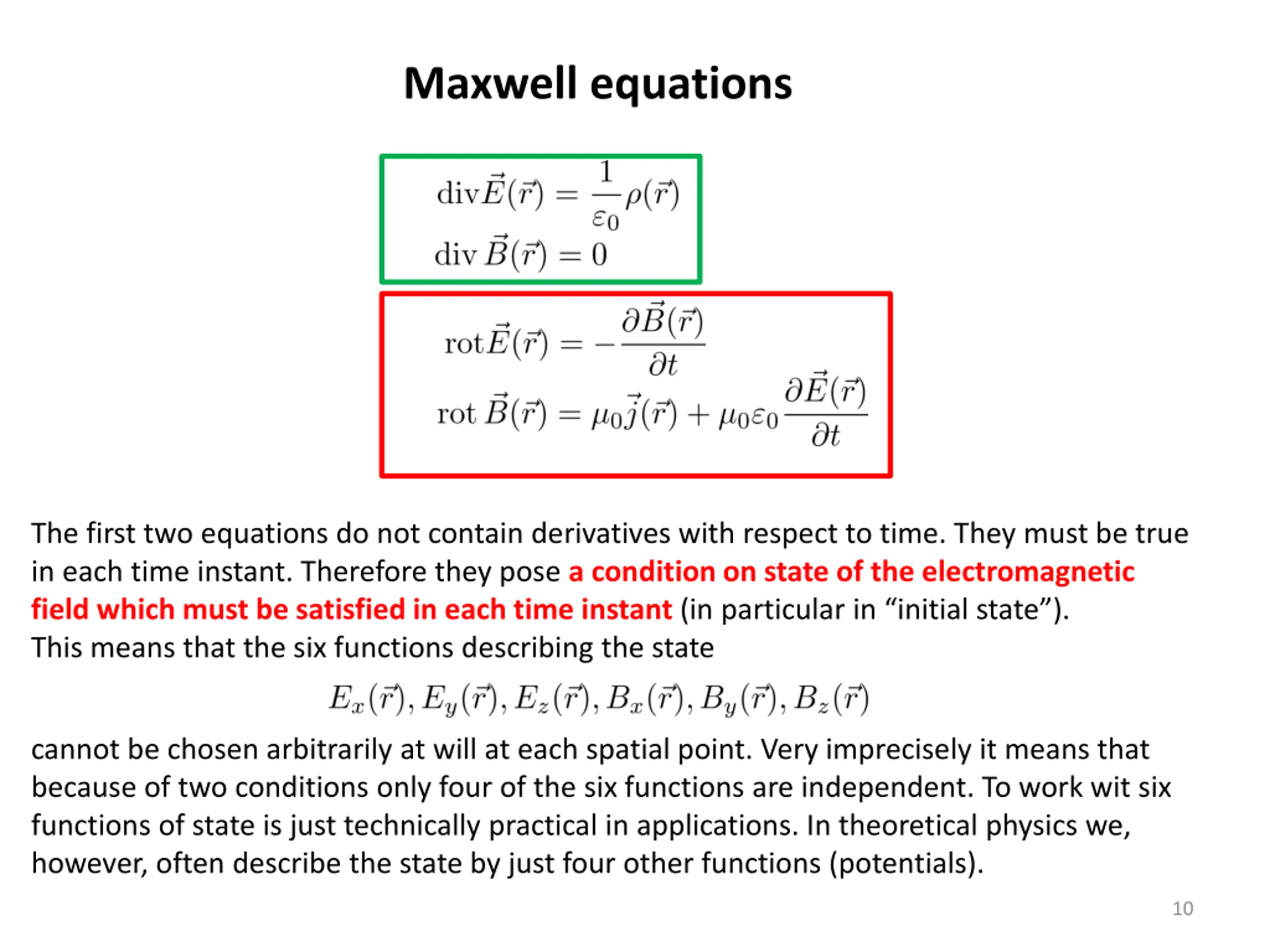 Maxwell equations The first two equations do not contain derivatives with respect to time. They must be true in each time instant. Therefore they pose a condition on state of the electromagnetic field which must be satisfied in each time instant (in particular in initial state ). This means that the six functions describing the state cannot be chosen arbitrarily at will at each spatial point. Very imprecisely it means that because of two conditions only four of the six functions are independent. To work wit six functions of state is just technically practical in applications. In theoretical physics we, however, often describe the state by just four other functions (potentials). 10