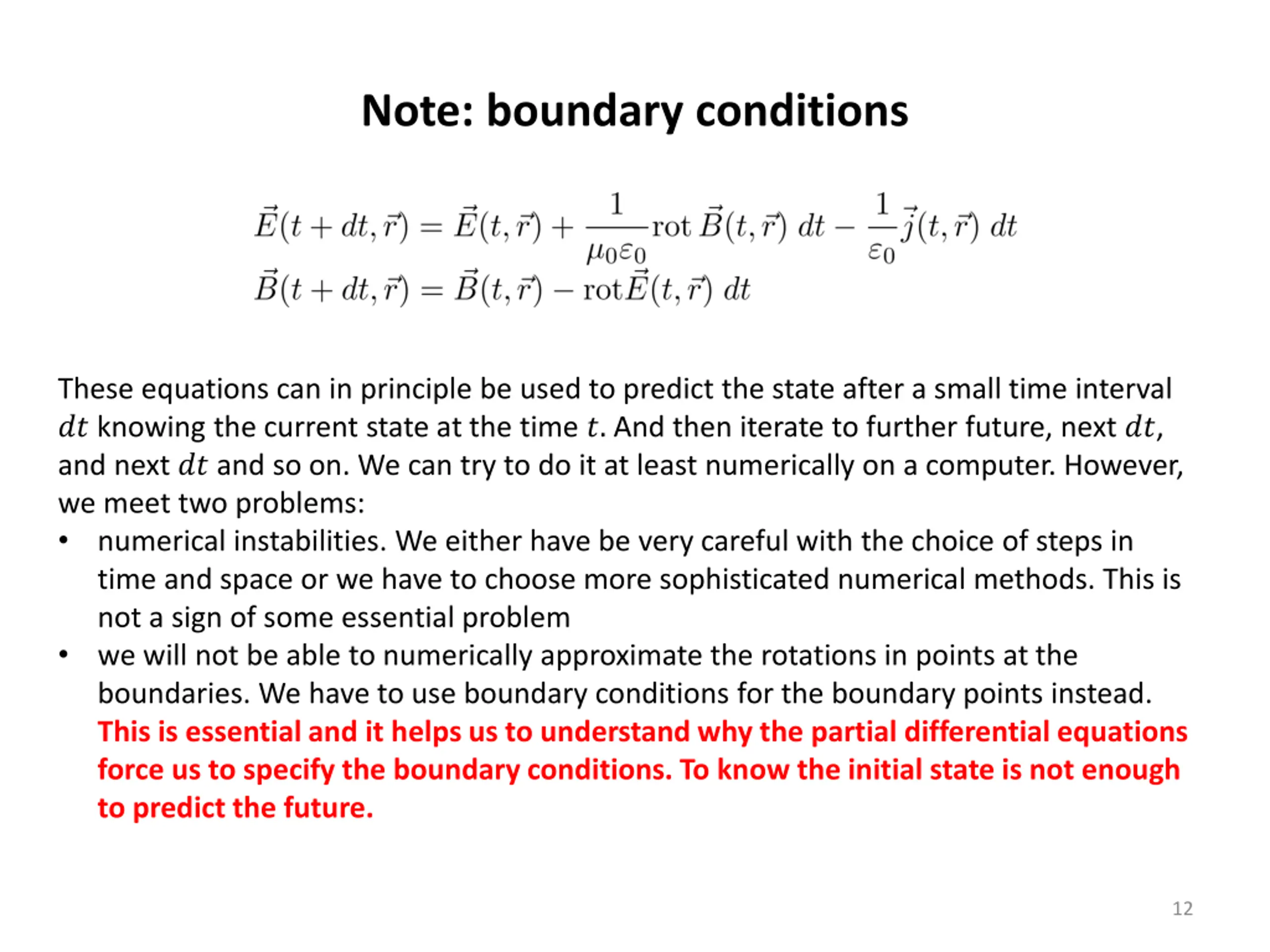 Note: boundary conditions These equations can in principle be used to predict the state after a small time interval ?? knowing the current state at the time ?. And then iterate to further future, next ??, and next ?? and so on. We can try to do it at least numerically on a computer. However, we meet two problems: numerical instabilities. We either have be very careful with the choice of steps in time and space or we have to choose more sophisticated numerical methods. This is not a sign of some essential problem we will not be able to numerically approximate the rotations in points at the boundaries. We have to use boundary conditions for the boundary points instead. This is essential and it helps us to understand why the partial differential equations force us to specify the boundary conditions. To know the initial state is not enough to predict the future. 12