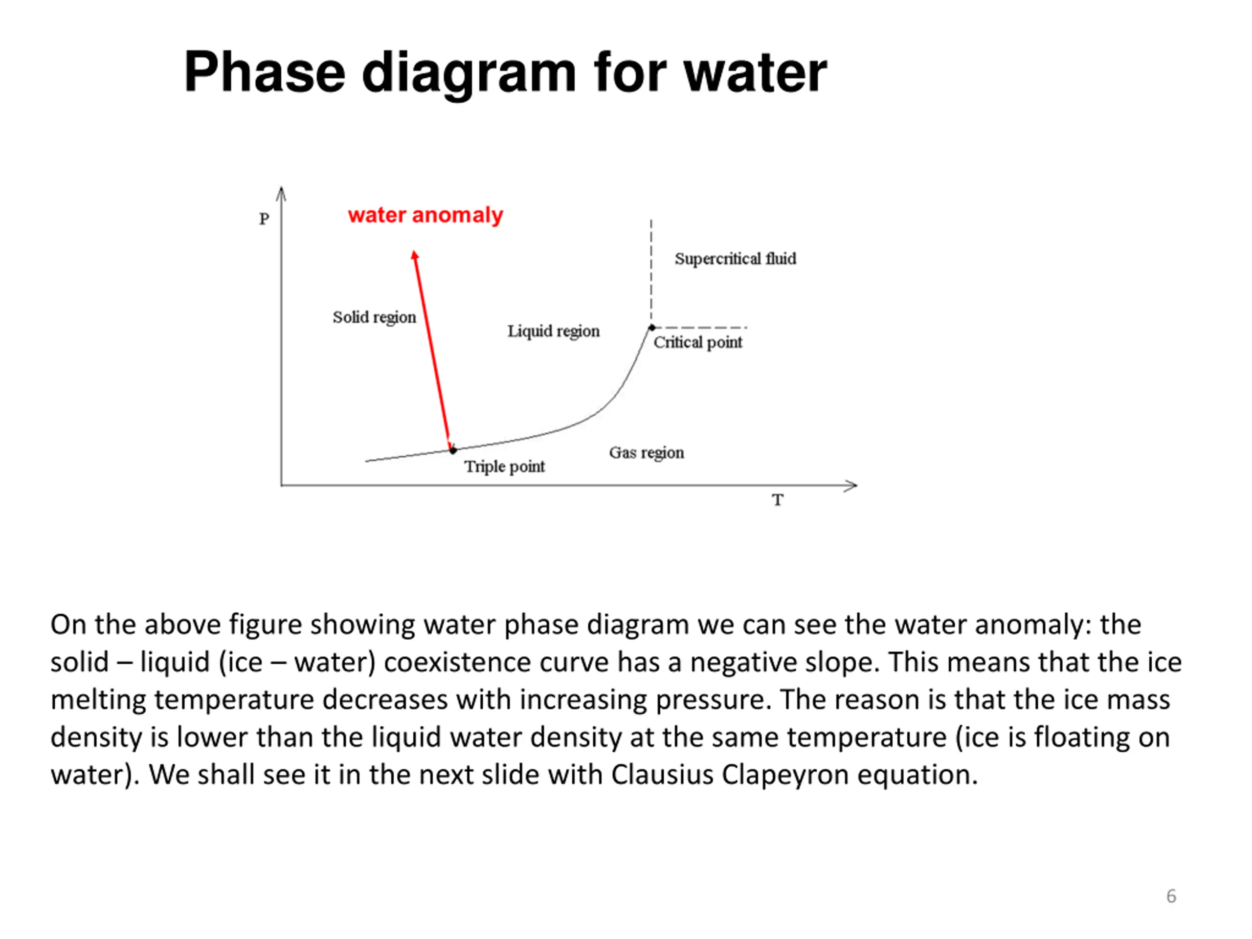 Phase diagram for water On the above figure showing water phase diagram we can see the water anomaly: the solid liquid (ice water) coexistence curve has a negative slope. This means that the ice melting temperature decreases with increasing pressure. The reason is that the ice mass density is lower than the liquid water density at the same temperature (ice is floating on water). We shall see it in the next slide with Clausius Clapeyron equation. 6