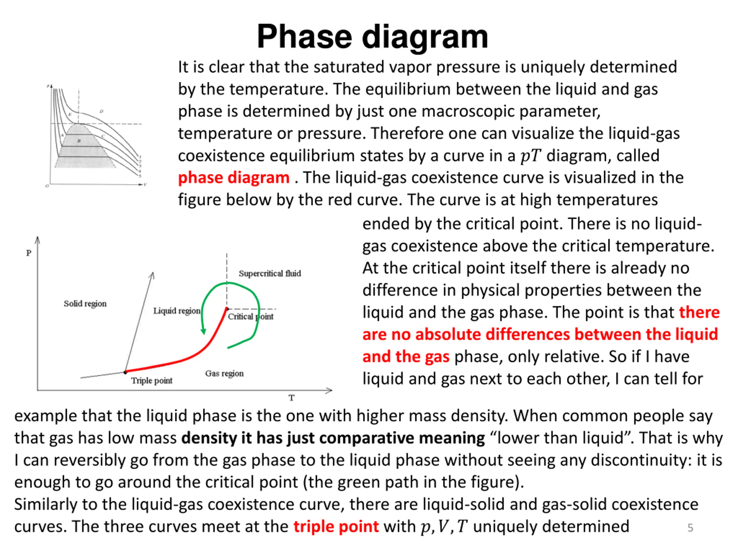 Phase diagram It is clear that the saturated vapor pressure is uniquely determined by the temperature. The equilibrium between the liquid and gas phase is determined by just one macroscopic parameter, temperature or pressure. Therefore one can visualize the liquid-gas coexistence equilibrium states by a curve in a ?? diagram, called phase diagram . The liquid-gas coexistence curve is visualized in the figure below by the red curve. The curve is at high temperatures ended by the critical point. There is no liquid- gas coexistence above the critical temperature. At the critical point itself there is already no difference in physical properties between the liquid and the gas phase. The point is that there are no absolute differences between the liquid and the gas phase, only relative. So if I have liquid and gas next to each other, I can tell for example that the liquid phase is the one with higher mass density. When common people say that gas has low mass density it has just comparative meaning lower than liquid . That is why I can reversibly go from the gas phase to the liquid phase without seeing any discontinuity: it is enough to go around the critical point (the green path in the figure). Similarly to the liquid-gas coexistence curve, there are liquid-solid and gas-solid coexistence curves. The three curves meet at the triple point with ?,?,? uniquely determined 5