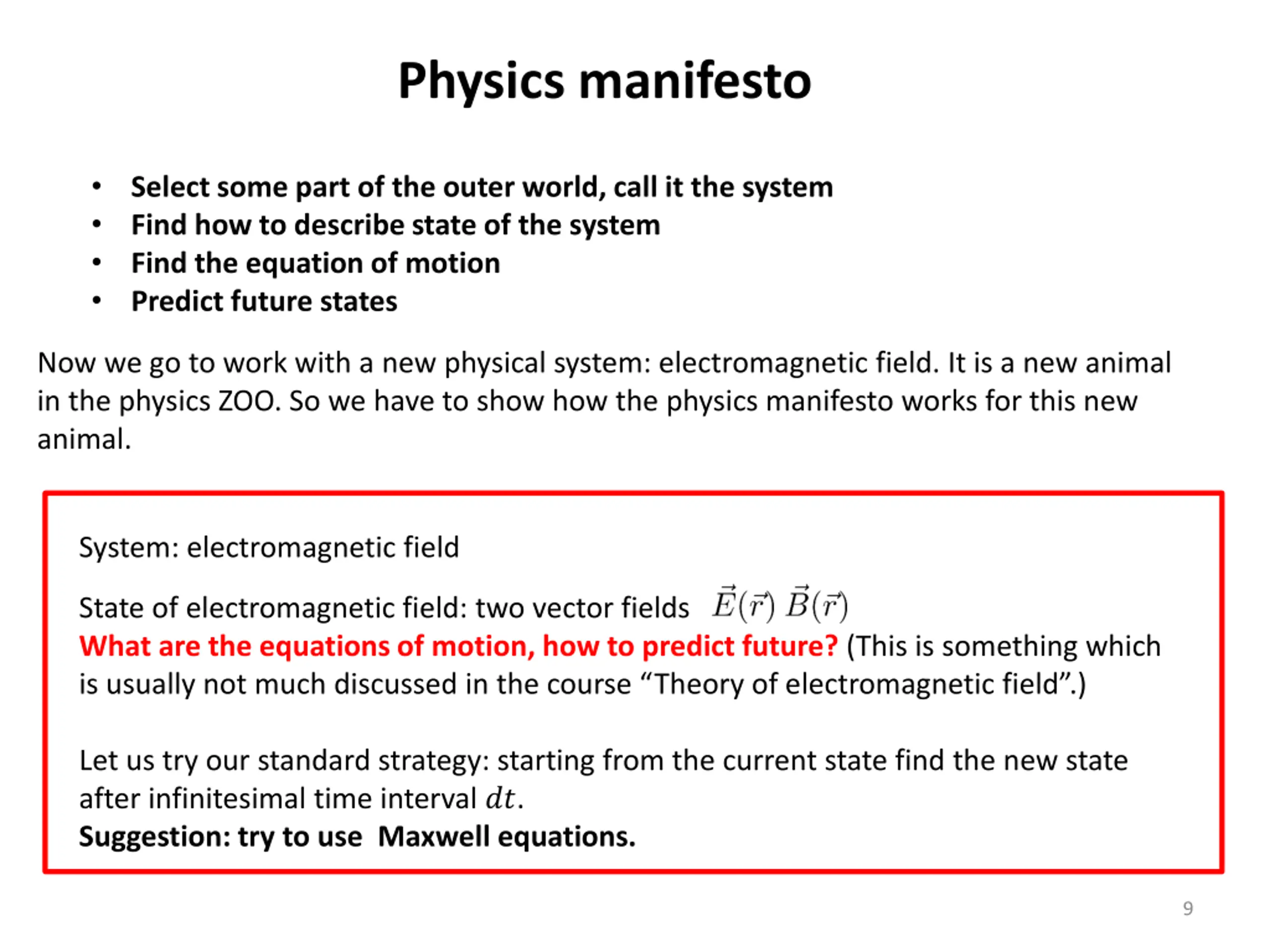 Physics manifesto Select some part of the outer world, call it the system Find how to describe state of the system Find the equation of motion Predict future states Now we go to work with a new physical system: electromagnetic field. It is a new animal in the physics ZOO. So we have to show how the physics manifesto works for this new animal. System: electromagnetic field State of electromagnetic field: two vector fields What are the equations of motion, how to predict future? (This is something which is usually not much discussed in the course Theory of electromagnetic field .) Let us try our standard strategy: starting from the current state find the new state after infinitesimal time interval ??. Suggestion: try to use Maxwell equations. 9