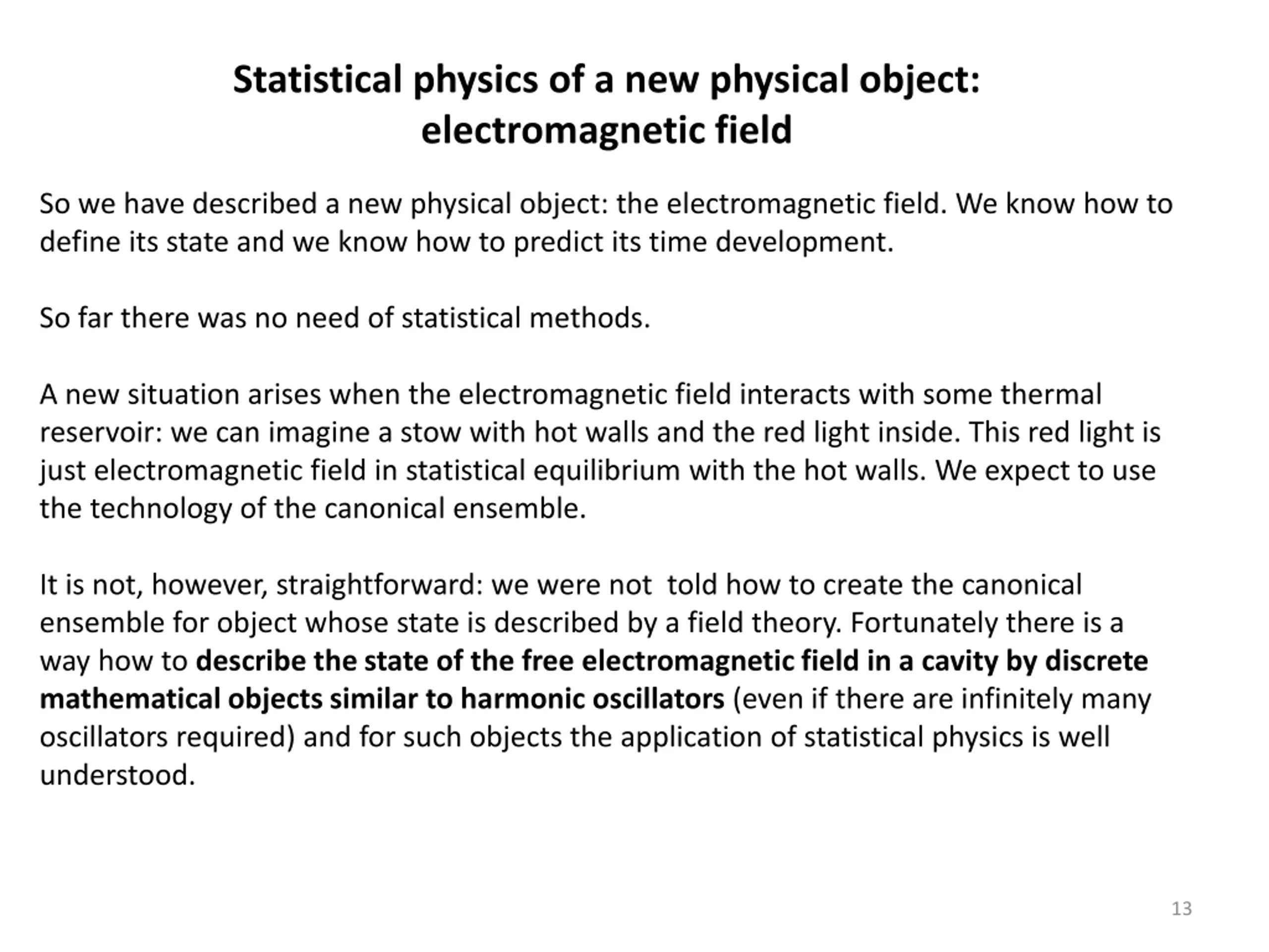 Statistical physics of a new physical object: electromagnetic field So we have described a new physical object: the electromagnetic field. We know how to define its state and we know how to predict its time development. So far there was no need of statistical methods. A new situation arises when the electromagnetic field interacts with some thermal reservoir: we can imagine a stow with hot walls and the red light inside. This red light is just electromagnetic field in statistical equilibrium with the hot walls. We expect to use the technology of the canonical ensemble. It is not, however, straightforward: we were not told how to create the canonical ensemble for object whose state is described by a field theory. Fortunately there is a way how to describe the state of the free electromagnetic field in a cavity by discrete mathematical objects similar to harmonic oscillators (even if there are infinitely many oscillators required) and for such objects the application of statistical physics is well understood. 13