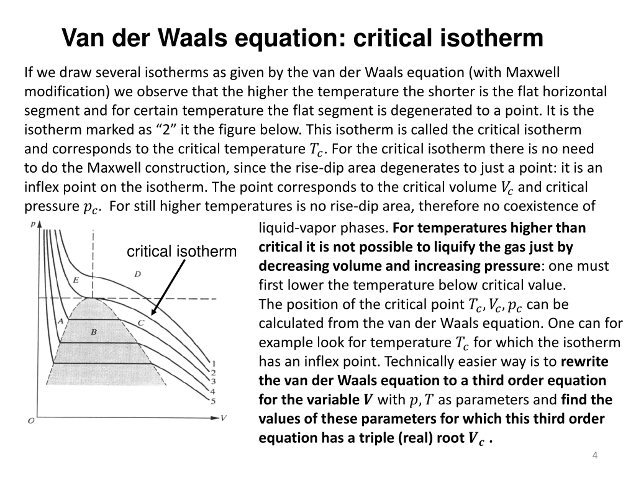 Van der Waals equation: critical isotherm If we draw several isotherms as given by the van der Waals equation (with Maxwell modification) we observe that the higher the temperature the shorter is the flat horizontal segment and for certain temperature the flat segment is degenerated to a point. It is the isotherm marked as 2 it the figure below. This isotherm is called the critical isotherm and corresponds to the critical temperature ??. For the critical isotherm there is no need to do the Maxwell construction, since the rise-dip area degenerates to just a point: it is an inflex point on the isotherm. The point corresponds to the critical volume ??and critical pressure ??. For still higher temperatures is no rise-dip area, therefore no coexistence of liquid-vapor phases. For temperatures higher than critical it is not possible to liquify the gas just by decreasing volume and increasing pressure: one must first lower the temperature below critical value. The position of the critical point ??,??,??can be calculated from the van der Waals equation. One can for example look for temperature ??for which the isotherm has an inflex point. Technically easier way is to rewrite the van der Waals equation to a third order equation for the variable ? with ?,? as parameters and find the values of these parameters for which this third order equation has a triple (real) root ??. critical isotherm 4