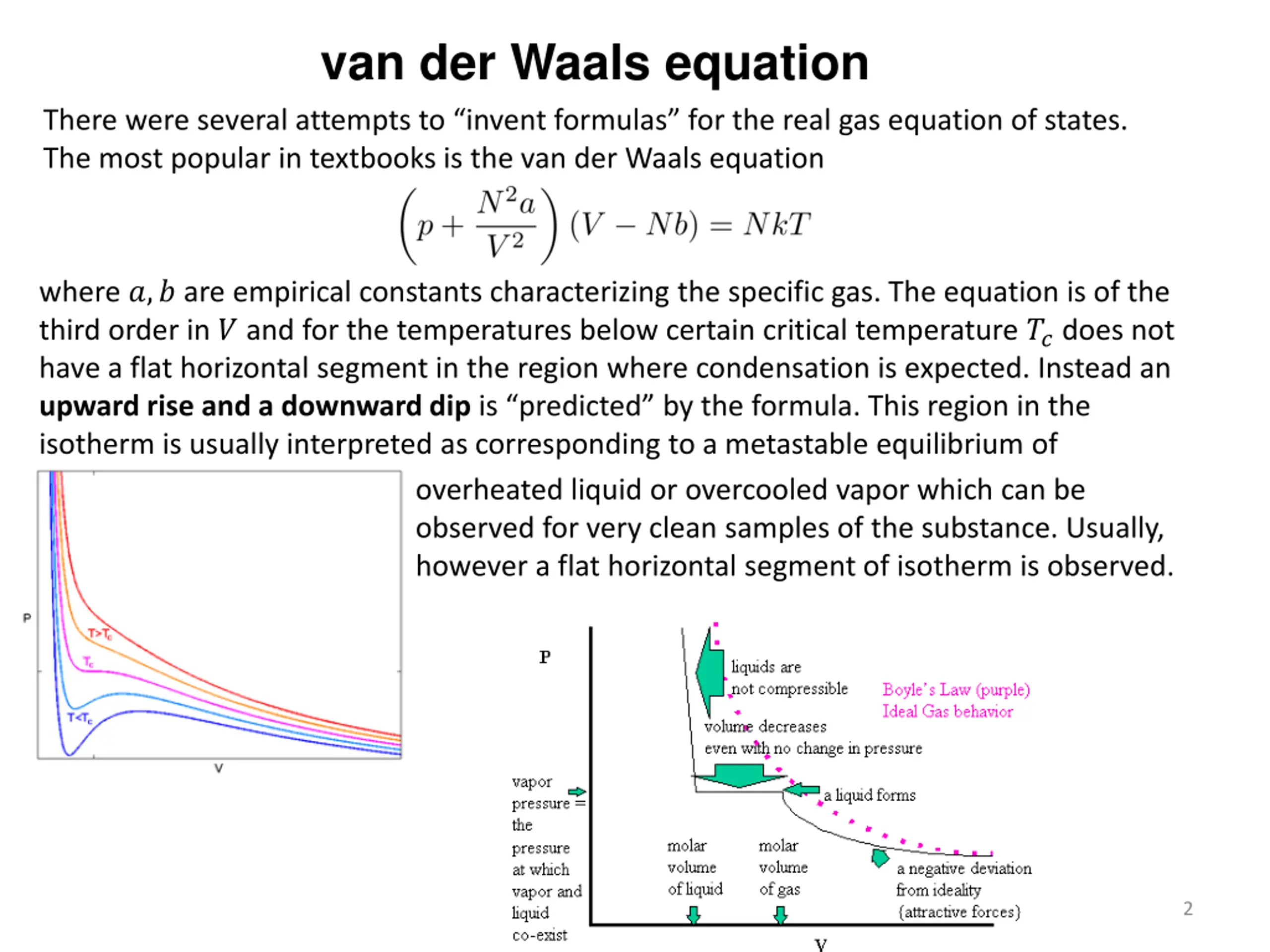 van der Waals equation There were several attempts to invent formulas for the real gas equation of states. The most popular in textbooks is the van der Waals equation where ?,? are empirical constants characterizing the specific gas. The equation is of the third order in ? and for the temperatures below certain critical temperature ??does not have a flat horizontal segment in the region where condensation is expected. Instead an upward rise and a downward dip is predicted by the formula. This region in the isotherm is usually interpreted as corresponding to a metastable equilibrium of overheated liquid or overcooled vapor which can be observed for very clean samples of the substance. Usually, however a flat horizontal segment of isotherm is observed. 2