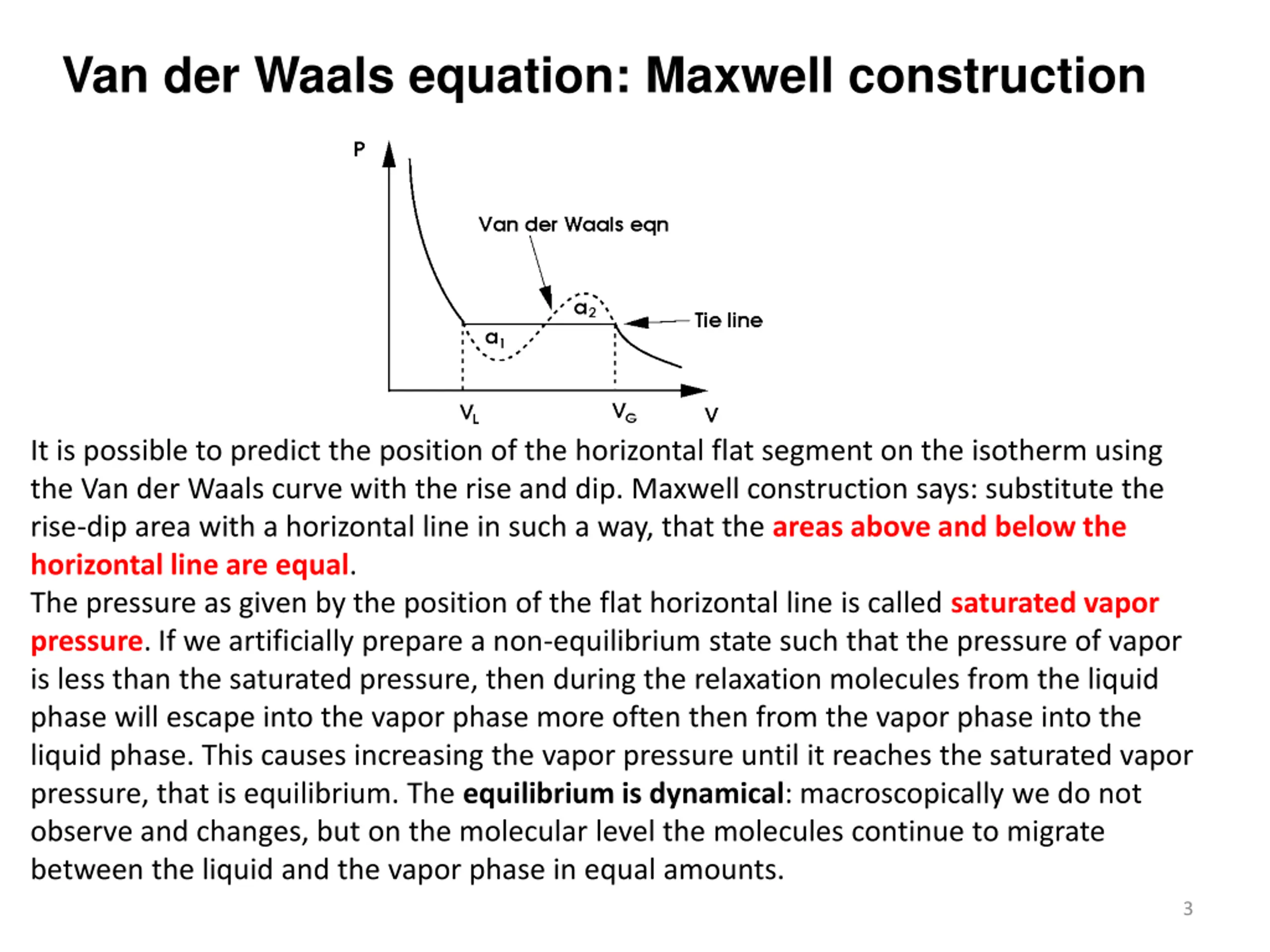 Van der Waals equation: Maxwell construction It is possible to predict the position of the horizontal flat segment on the isotherm using the Van der Waals curve with the rise and dip. Maxwell construction says: substitute the rise-dip area with a horizontal line in such a way, that the areas above and below the horizontal line are equal. The pressure as given by the position of the flat horizontal line is called saturated vapor pressure. If we artificially prepare a non-equilibrium state such that the pressure of vapor is less than the saturated pressure, then during the relaxation molecules from the liquid phase will escape into the vapor phase more often then from the vapor phase into the liquid phase. This causes increasing the vapor pressure until it reaches the saturated vapor pressure, that is equilibrium. The equilibrium is dynamical: macroscopically we do not observe and changes, but on the molecular level the molecules continue to migrate between the liquid and the vapor phase in equal amounts. 3