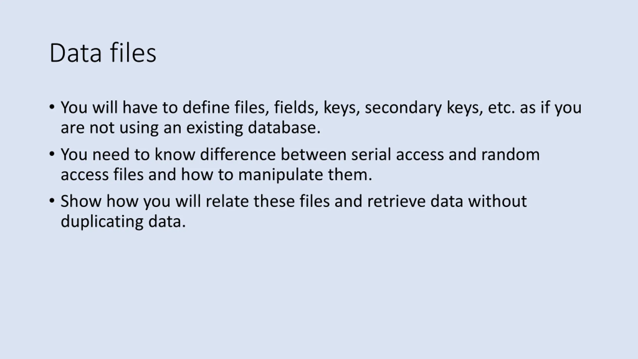 Data files You will have to define files, fields, keys, secondary keys, etc. as if you are not using an existing database. You need to know difference between serial access and random access files and how to manipulate them. Show how you will relate these files and retrieve data without duplicating data.