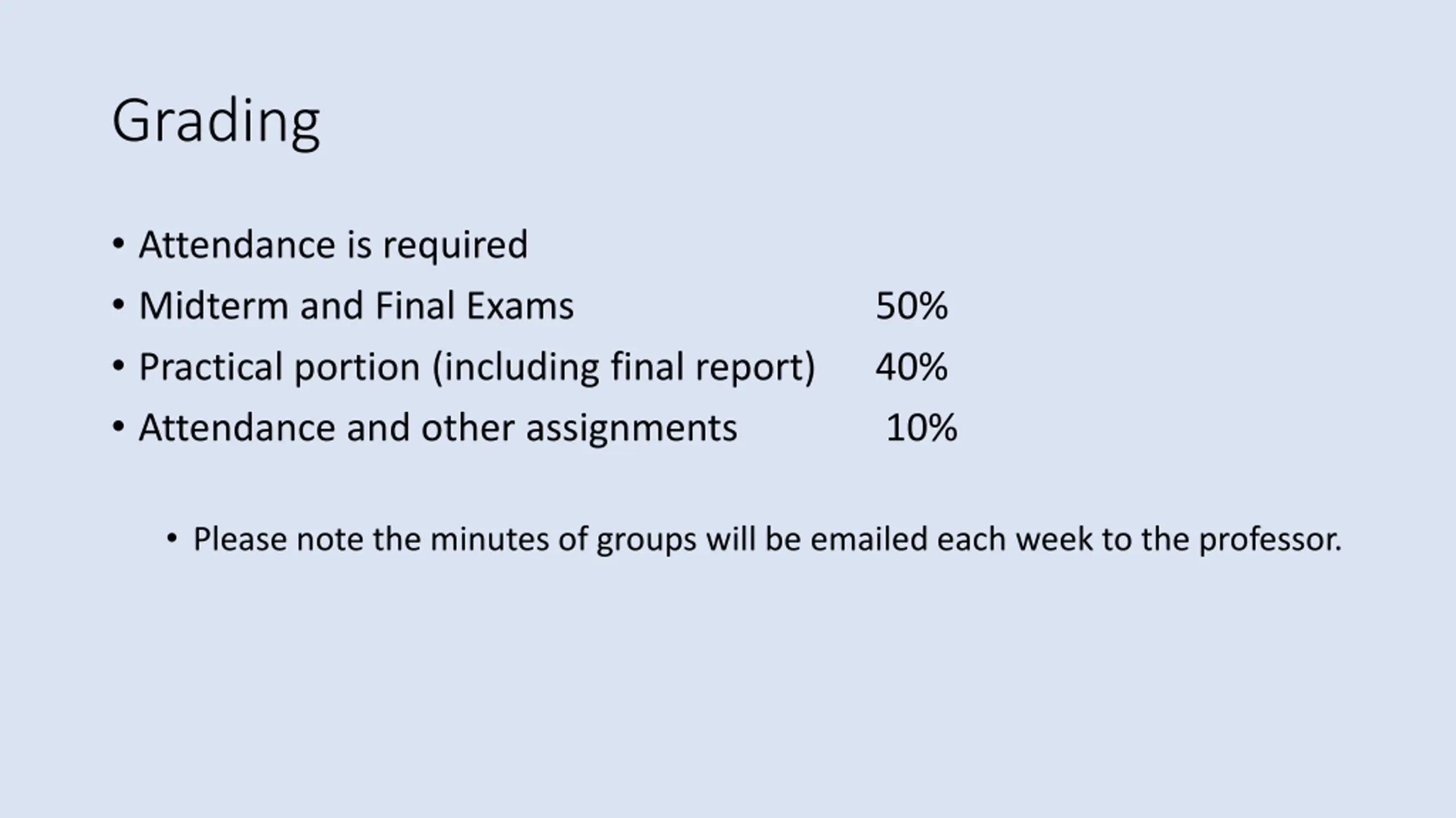 Grading Attendance is required Midterm and Final Exams Practical portion (including final report) Attendance and other assignments 50% 40% 10% Please note the minutes of groups will be emailed each week to the professor.