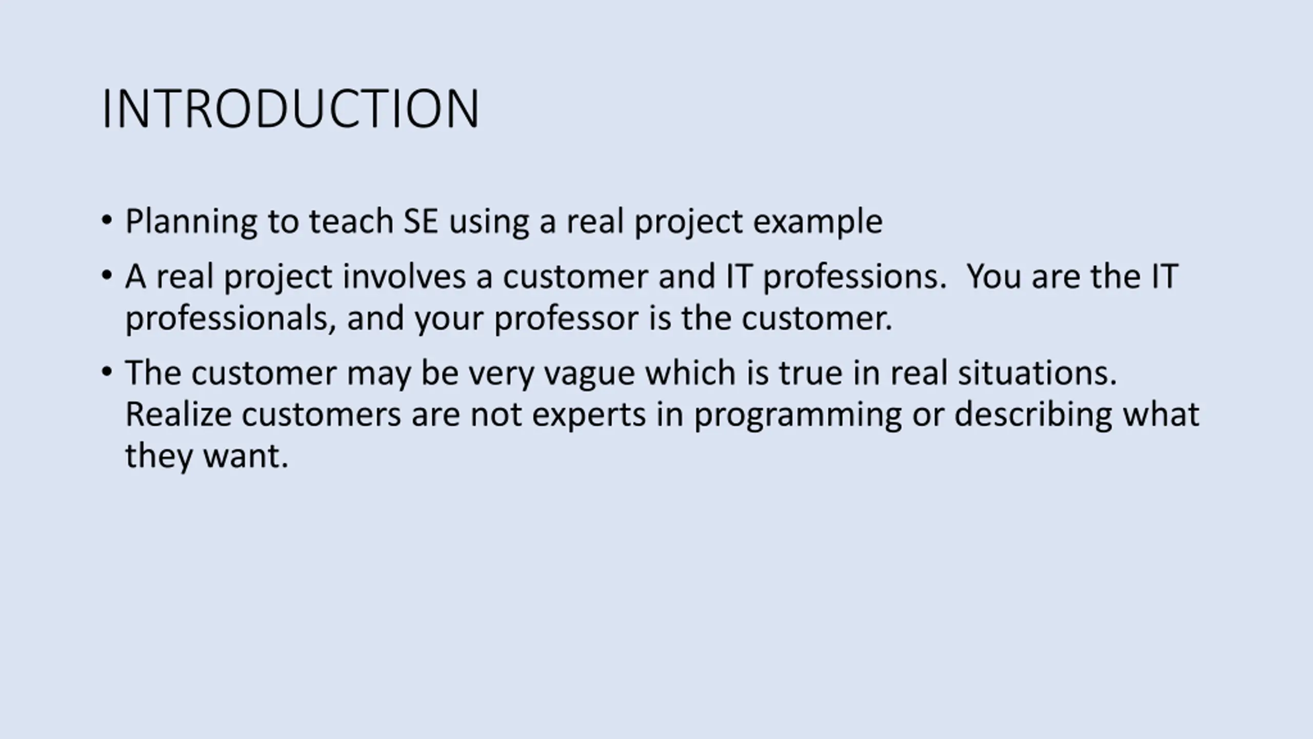 INTRODUCTION Planning to teach SE using a real project example A real project involves a customer and IT professions. You are the IT professionals, and your professor is the customer. The customer may be very vague which is true in real situations. Realize customers are not experts in programming or describing what they want.