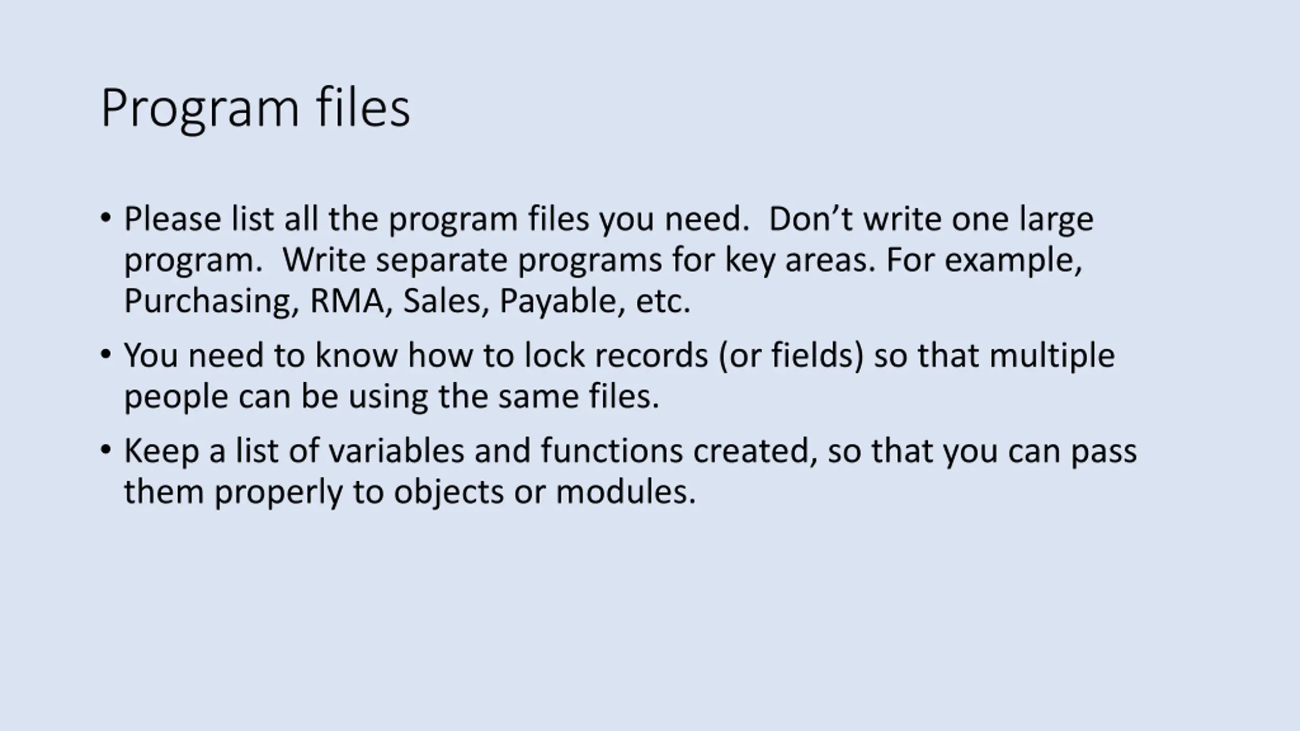 Program files Please list all the program files you need. Don t write one large program. Write separate programs for key areas. For example, Purchasing, RMA, Sales, Payable, etc. You need to know how to lock records (or fields) so that multiple people can be using the same files. Keep a list of variables and functions created, so that you can pass them properly to objects or modules.