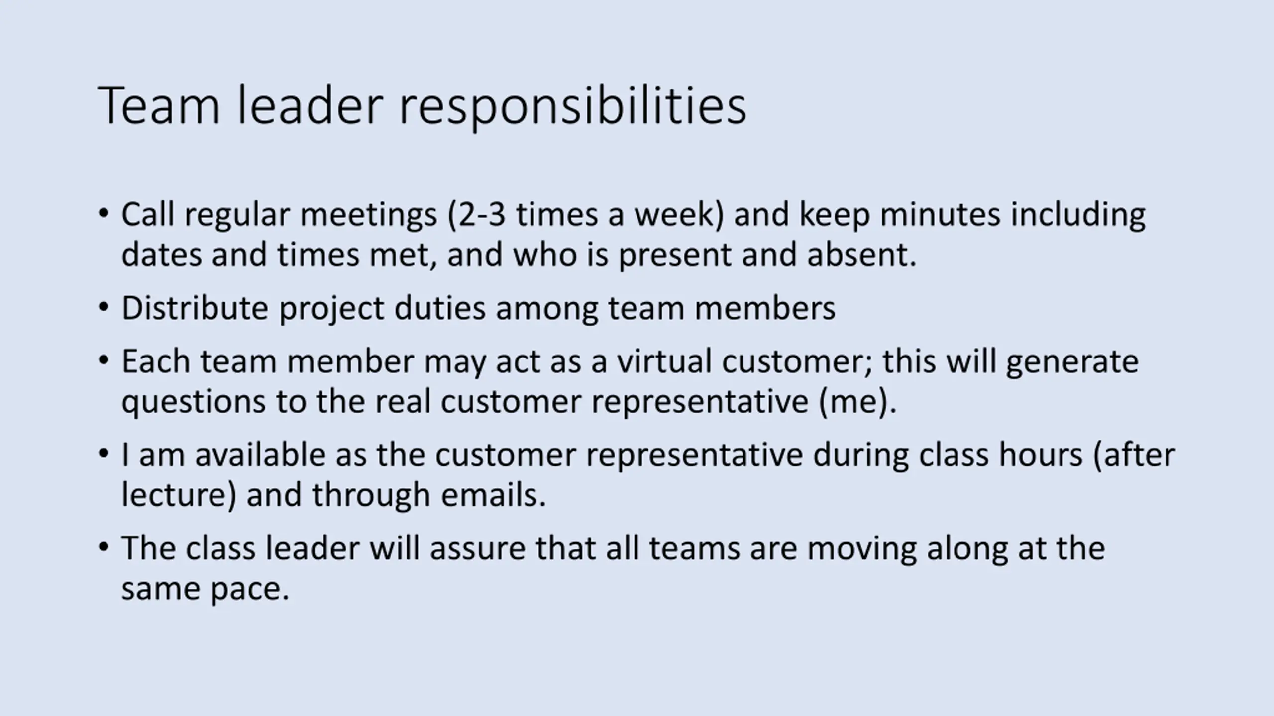 Team leader responsibilities Call regular meetings (2-3 times a week) and keep minutes including dates and times met, and who is present and absent. Distribute project duties among team members Each team member may act as a virtual customer; this will generate questions to the real customer representative (me). I am available as the customer representative during class hours (after lecture) and through emails. The class leader will assure that all teams are moving along at the same pace.
