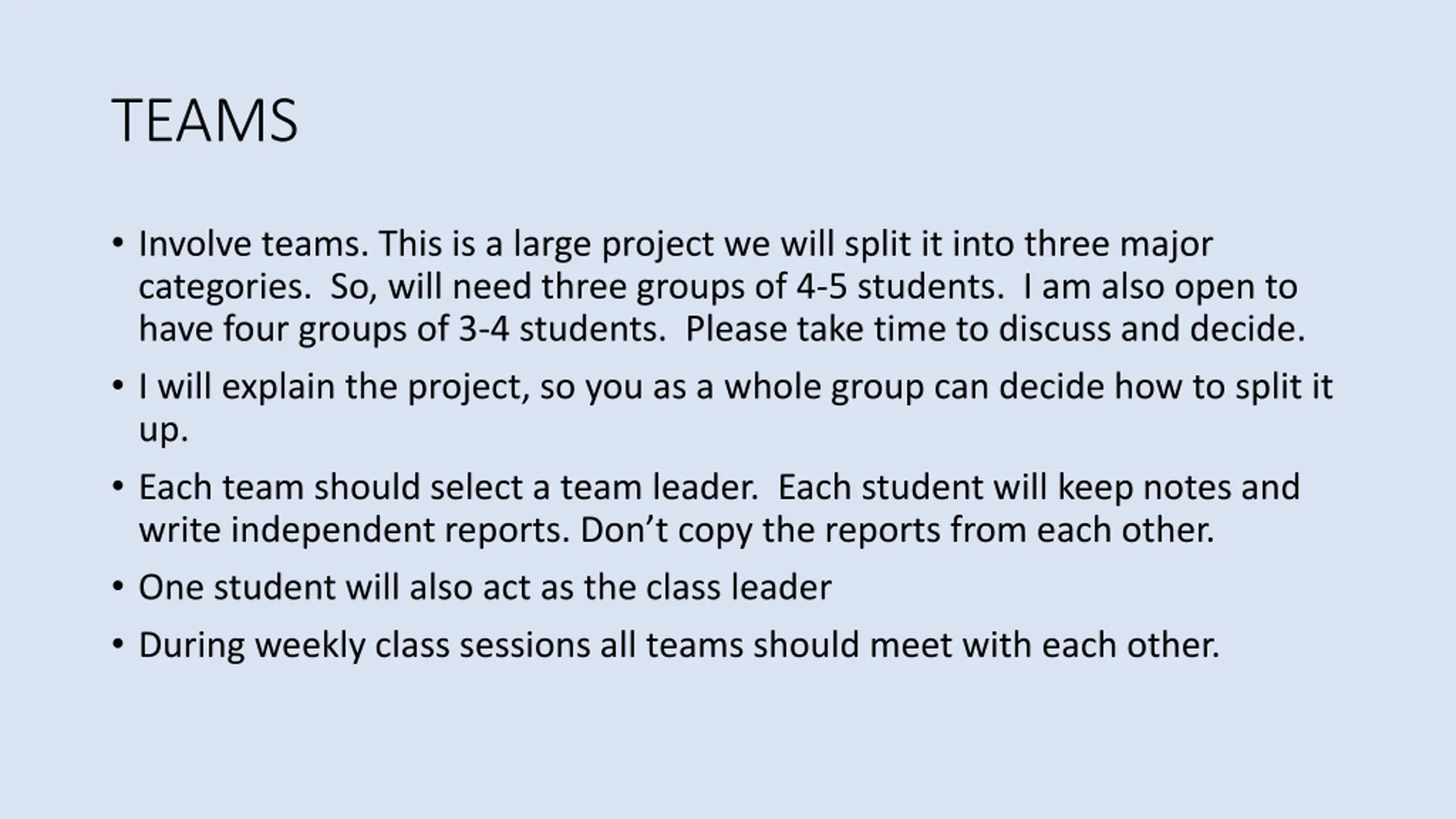 TEAMS Involve teams. This is a large project we will split it into three major categories. So, will need three groups of 4-5 students. I am also open to have four groups of 3-4 students. Please take time to discuss and decide. I will explain the project, so you as a whole group can decide how to split it up. Each team should select a team leader. Each student will keep notes and write independent reports. Don t copy the reports from each other. One student will also act as the class leader During weekly class sessions all teams should meet with each other.