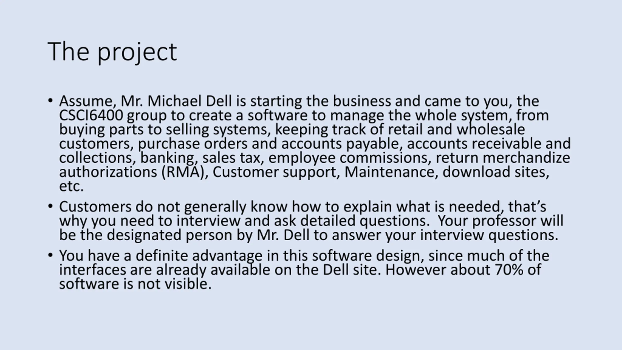 The project Assume, Mr. Michael Dell is starting the business and came to you, the CSCI6400 group to create a software to manage the whole system, from buying parts to selling systems, keeping track of retail and wholesale customers, purchase orders and accounts payable, accounts receivable and collections, banking, sales tax, employee commissions, return merchandize authorizations (RMA), Customer support, Maintenance, download sites, etc. Customers do not generally know how to explain what is needed, that s why you need to interview and ask detailed questions. Your professor will be the designated person by Mr. Dell to answer your interview questions. You have a definite advantage in this software design, since much of the interfaces are already available on the Dell site. However about 70% of software is not visible.