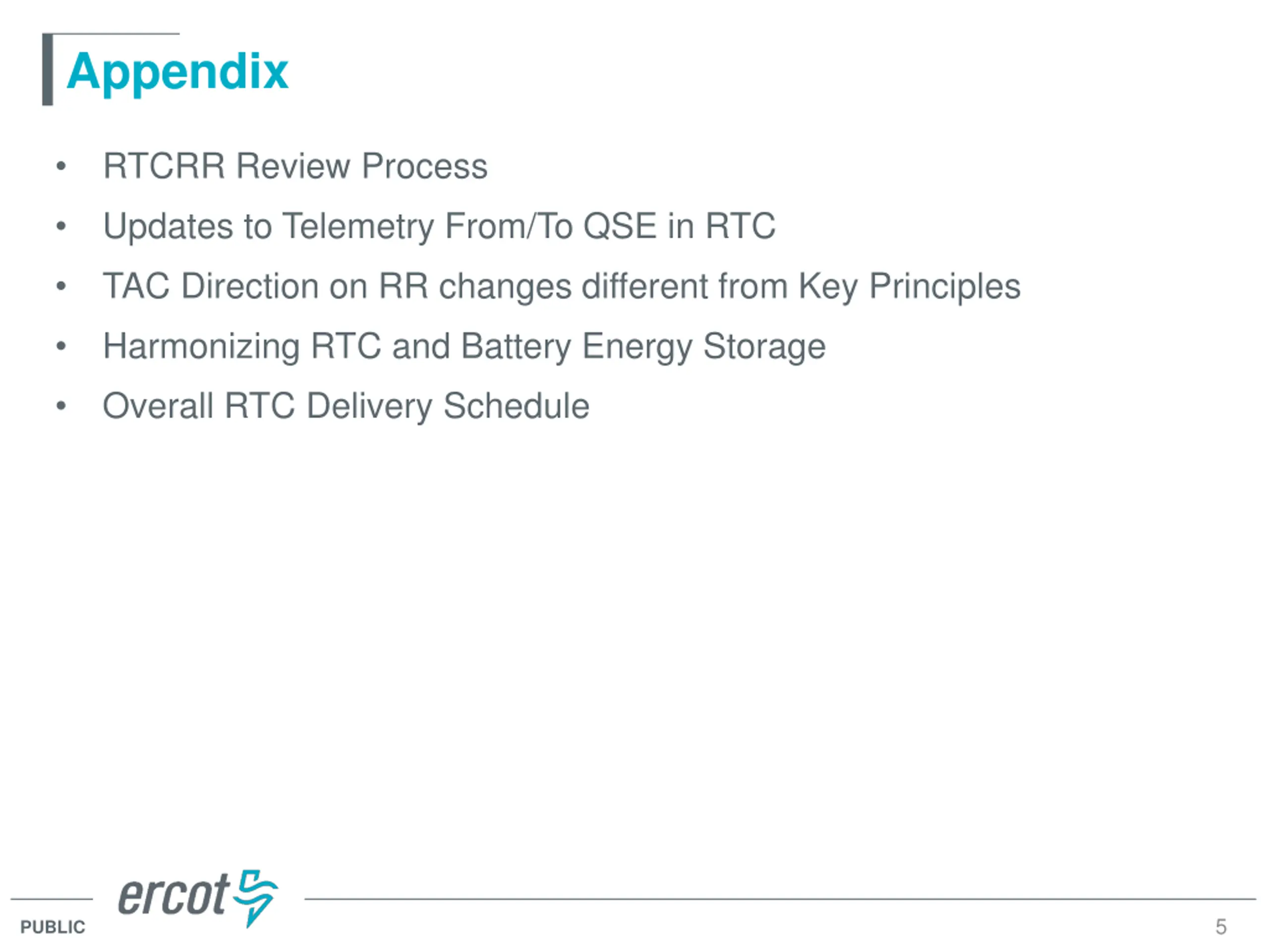 Appendix RTCRR Review Process Updates to Telemetry From/To QSE in RTC TAC Direction on RR changes different from Key Principles Harmonizing RTC and Battery Energy Storage Overall RTC Delivery Schedule 5 PUBLIC