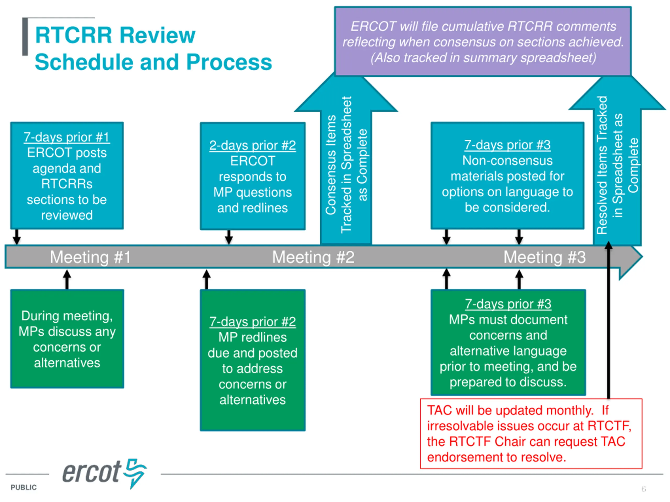 ERCOT will file cumulative RTCRR comments reflecting when consensus on sections achieved. (Also tracked in summary spreadsheet) RTCRR Review Schedule and Process Resolved Items Tracked Tracked in Spreadsheet in Spreadsheet as Consensus Items as Complete 7-days prior #1 ERCOT posts agenda and RTCRRs sections to be reviewed 7-days prior #3 Non-consensus materials posted for options on language to be considered. 2-days prior #2 ERCOT responds to MP questions and redlines Complete Meeting #1 Meeting #2 Meeting #3 7-days prior #3 MPs must document concerns and alternative language prior to meeting, and be prepared to discuss. During meeting, MPs discuss any concerns or alternatives 7-days prior #2 MP redlines due and posted to address concerns or alternatives TAC will be updated monthly. If irresolvable issues occur at RTCTF, the RTCTF Chair can request TAC endorsement to resolve. PUBLIC 6 8