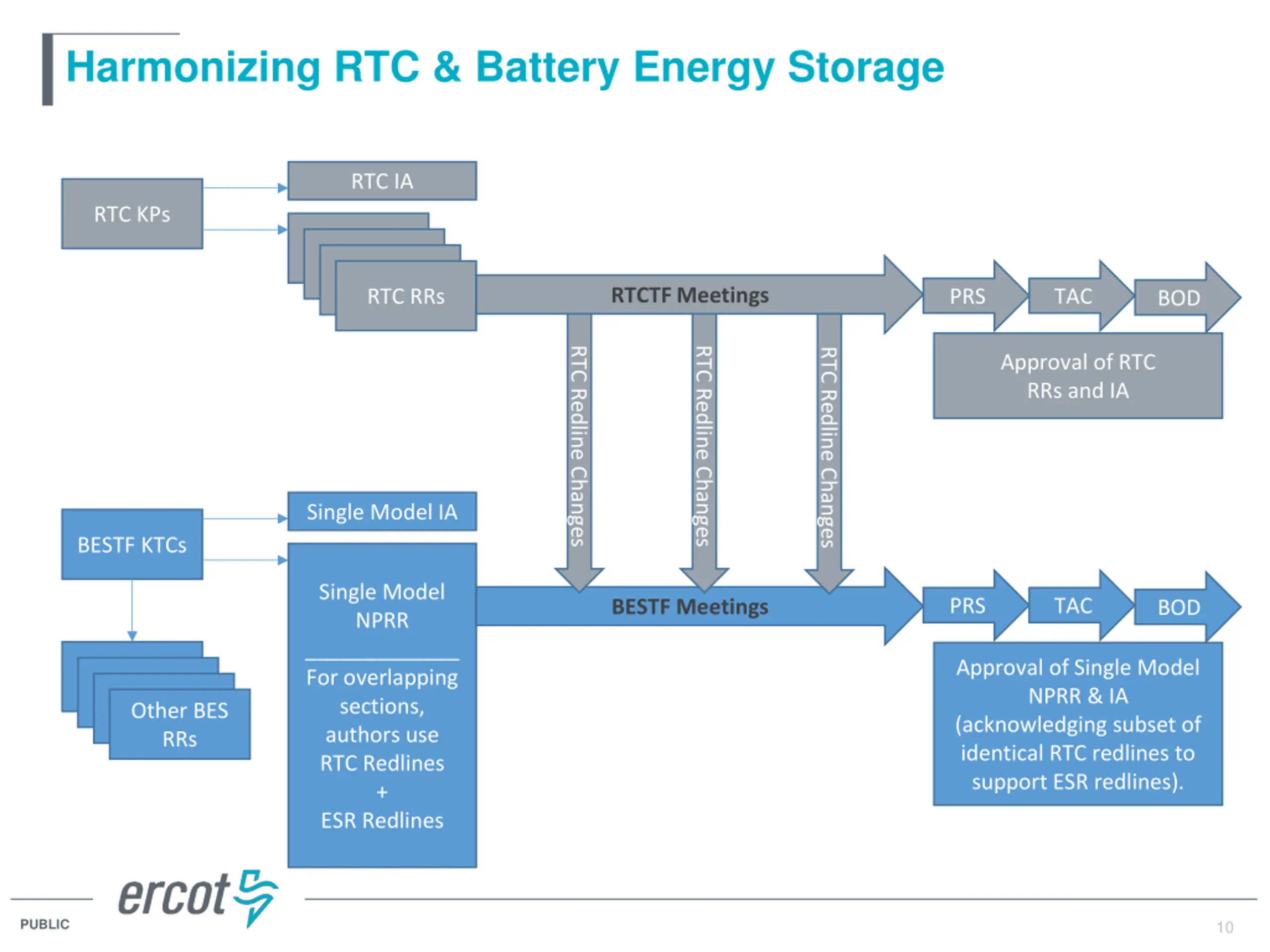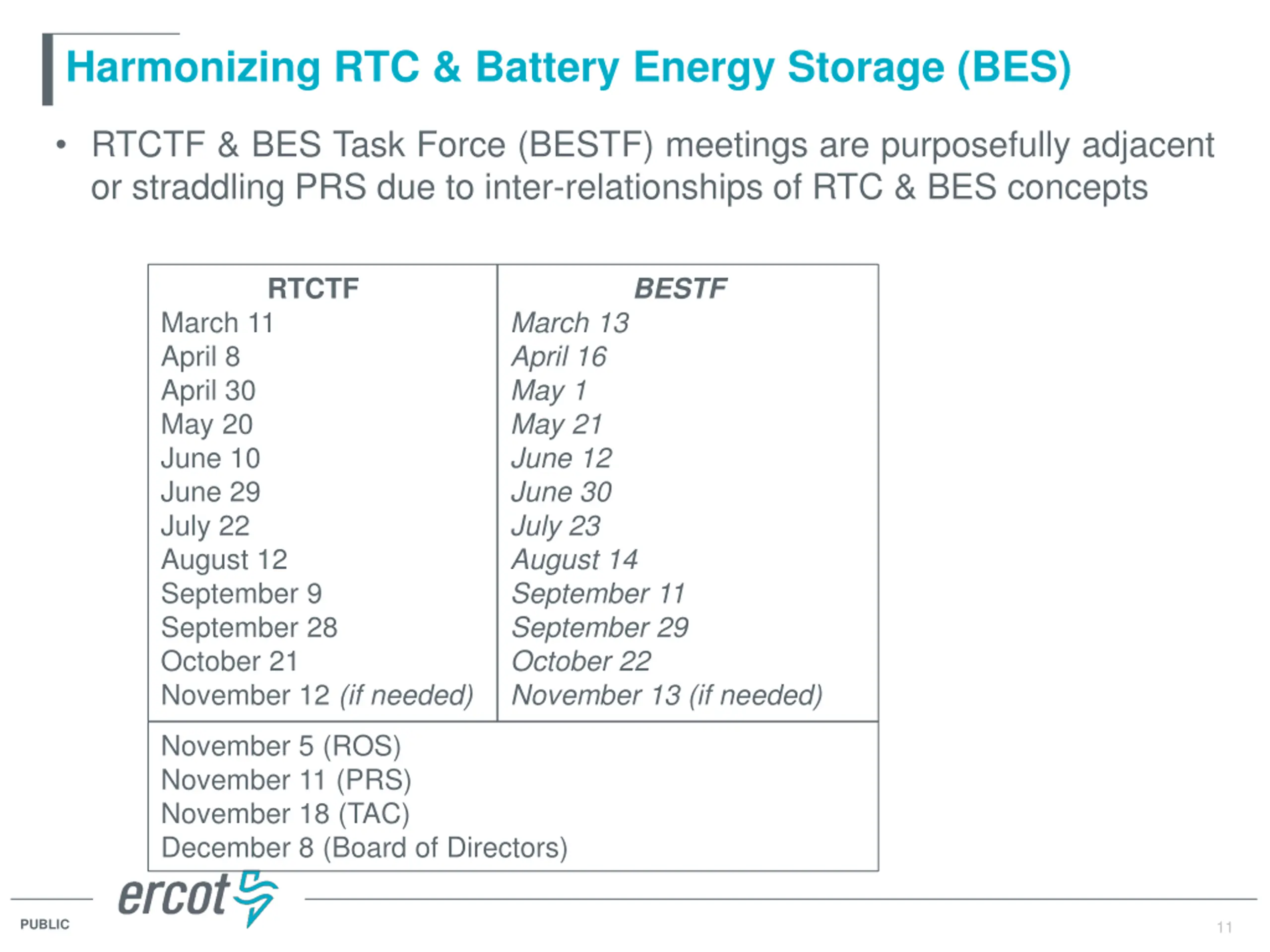 Harmonizing RTC & Battery Energy Storage RTC IA RTC KPs RTCTF Meetings RTC RRs PRS TAC BOD RTC Redline Changes RTC Redline Changes RTC Redline Changes Approval of RTC RRs and IA Single Model IA BESTF KTCs Single Model NPRR _____________ For overlapping sections, authors use RTC Redlines + ESR Redlines PRS TAC BESTF Meetings BOD Approval of Single Model NPRR & IA (acknowledging subset of identical RTC redlines to support ESR redlines). Other BES RRs 10 PUBLIC 10
