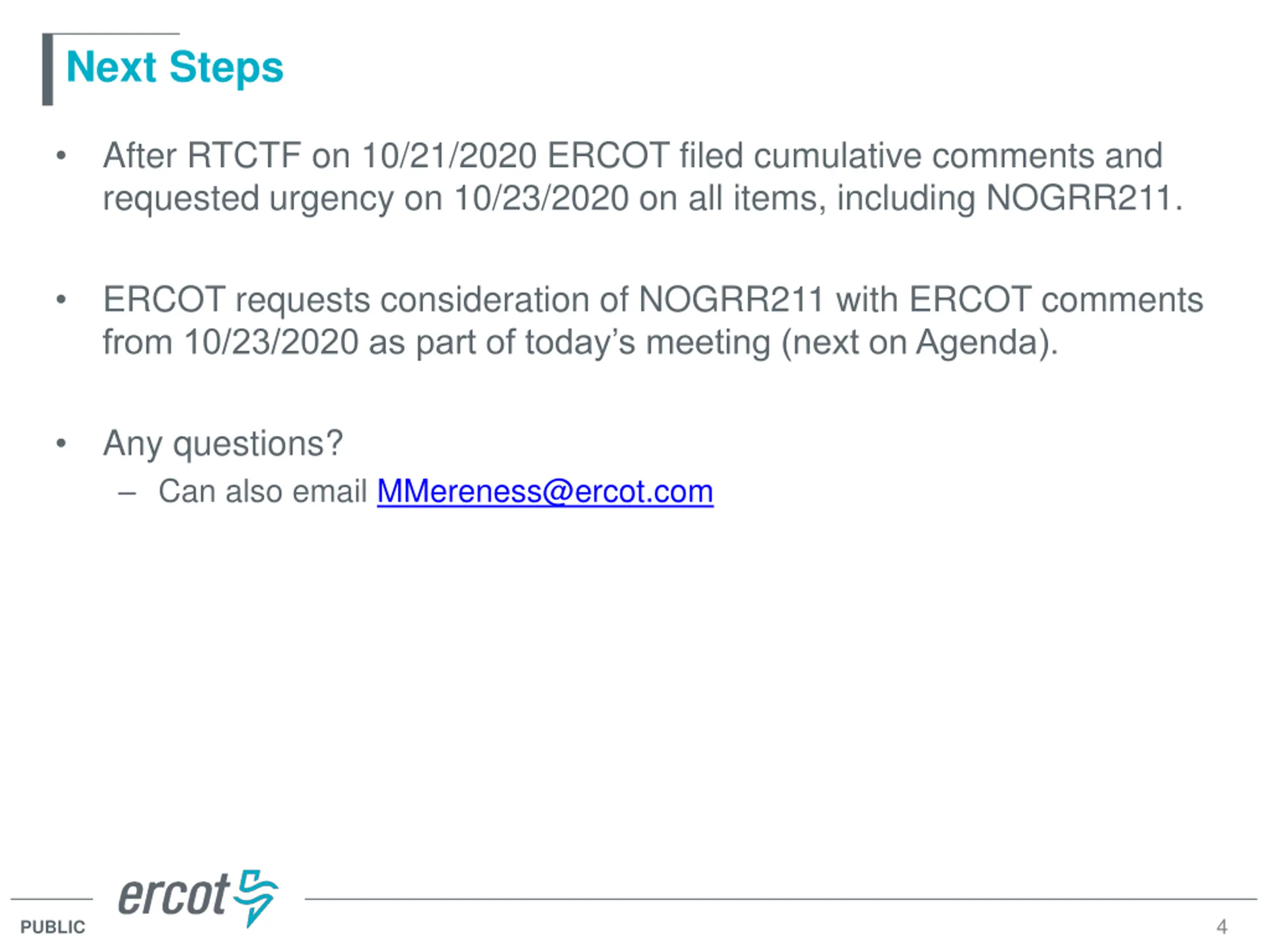 Next Steps After RTCTF on 10/21/2020 ERCOT filed cumulative comments and requested urgency on 10/23/2020 on all items, including NOGRR211. ERCOT requests consideration of NOGRR211 with ERCOT comments from 10/23/2020 as part of today s meeting (next on Agenda). Any questions? Can also email MMereness@ercot.com 4 PUBLIC