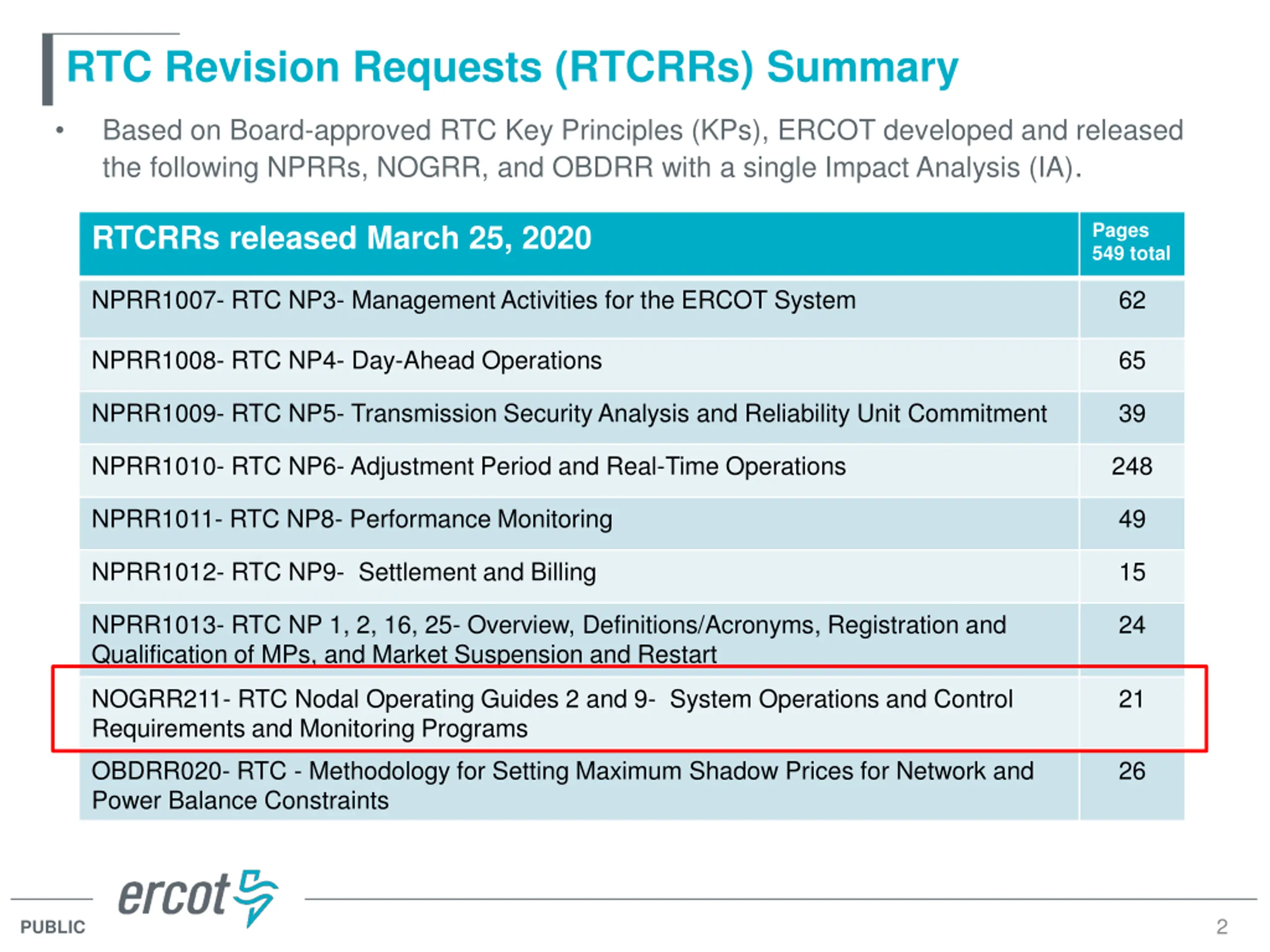 RTC Revision Requests (RTCRRs) Summary Based on Board-approved RTC Key Principles (KPs), ERCOT developed and released the following NPRRs, NOGRR, and OBDRR with a single Impact Analysis (IA). Pages 549 total RTCRRs released March 25, 2020 NPRR1007- RTC NP3- Management Activities for the ERCOT System 62 NPRR1008- RTC NP4- Day-Ahead Operations 65 NPRR1009- RTC NP5- Transmission Security Analysis and Reliability Unit Commitment 39 NPRR1010- RTC NP6- Adjustment Period and Real-Time Operations 248 NPRR1011- RTC NP8- Performance Monitoring 49 NPRR1012- RTC NP9- Settlement and Billing 15 NPRR1013- RTC NP 1, 2, 16, 25- Overview, Definitions/Acronyms, Registration and Qualification of MPs, and Market Suspension and Restart 24 NOGRR211- RTC Nodal Operating Guides 2 and 9- System Operations and Control Requirements and Monitoring Programs 21 OBDRR020- RTC - Methodology for Setting Maximum Shadow Prices for Network and Power Balance Constraints 26 2 PUBLIC