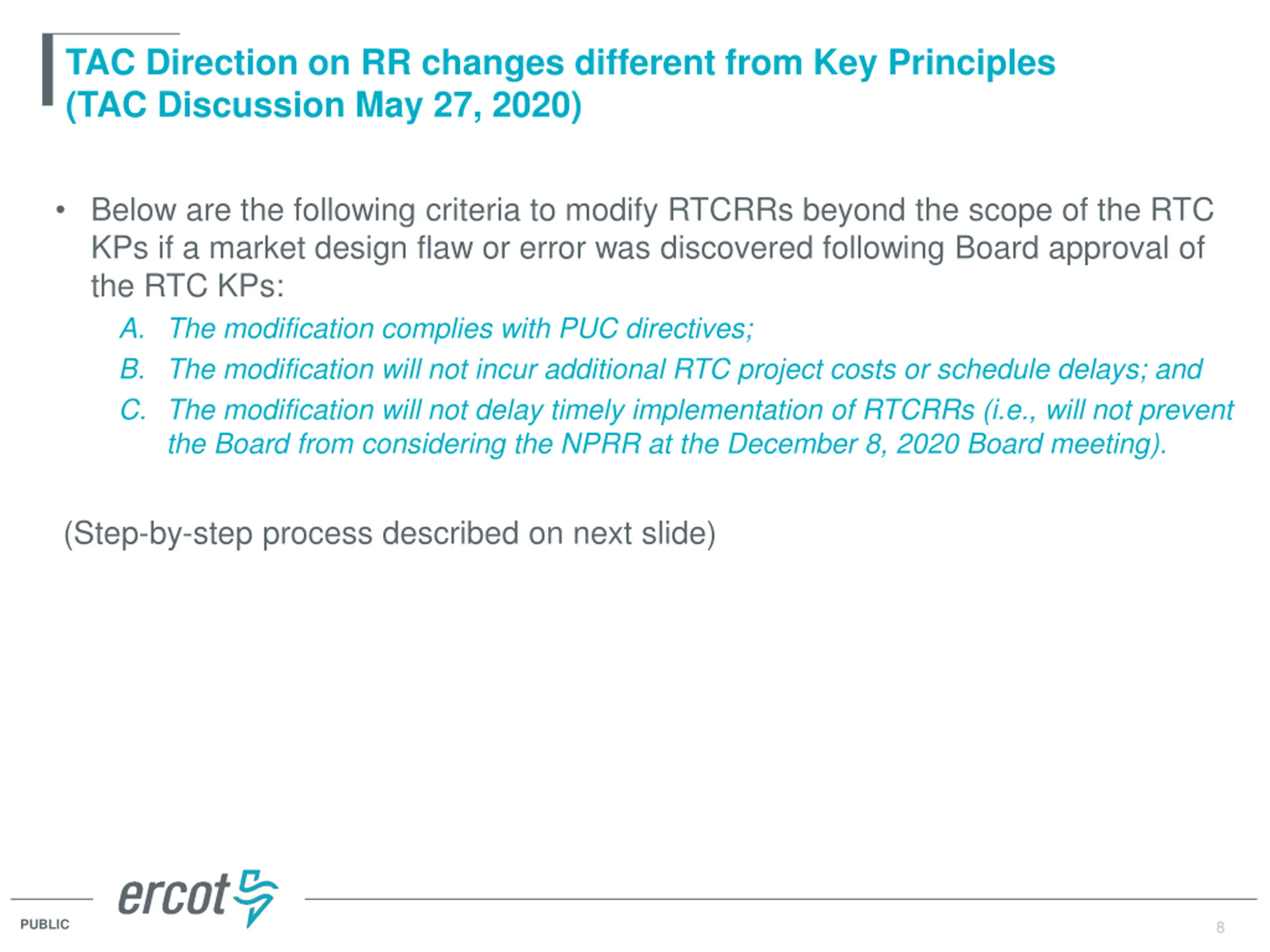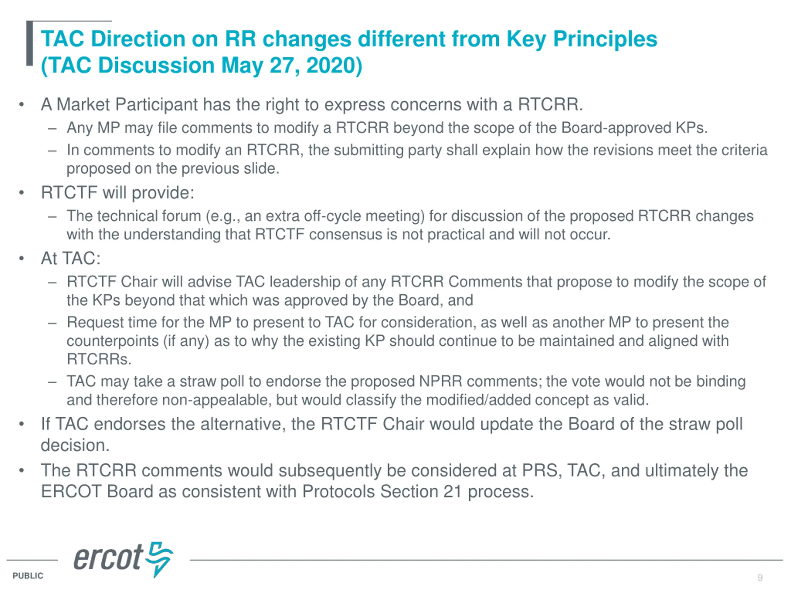 TAC Direction on RR changes different from Key Principles (TAC Discussion May 27, 2020) Below are the following criteria to modify RTCRRs beyond the scope of the RTC KPs if a market design flaw or error was discovered following Board approval of the RTC KPs: A. The modification complies with PUC directives; B. The modification will not incur additional RTC project costs or schedule delays; and C. The modification will not delay timely implementation of RTCRRs (i.e., will not prevent the Board from considering the NPRR at the December 8, 2020 Board meeting). (Step-by-step process described on next slide) 8 PUBLIC 8