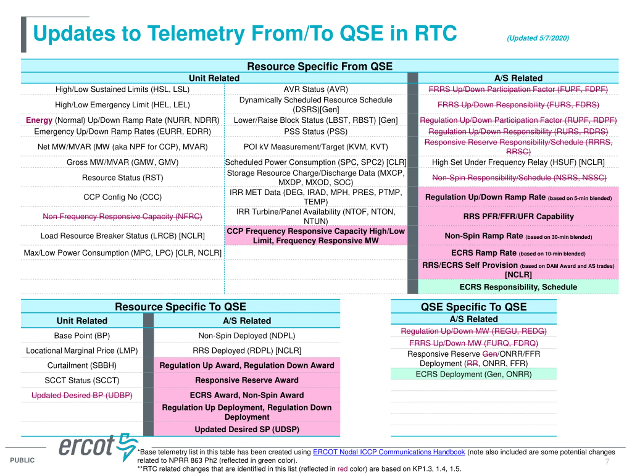 Updates to Telemetry From/To QSE in RTC (Updated 5/7/2020) Resource Specific From QSE Unit Related A/S Related High/Low Sustained Limits (HSL, LSL) AVR Status (AVR) FRRS Up/Down Participation Factor (FUPF, FDPF) Dynamically Scheduled Resource Schedule (DSRS)[Gen] Lower/Raise Block Status (LBST, RBST) [Gen] PSS Status (PSS) High/Low Emergency Limit (HEL, LEL) FRRS Up/Down Responsibility (FURS, FDRS) Energy (Normal) Up/Down Ramp Rate (NURR, NDRR) Emergency Up/Down Ramp Rates (EURR, EDRR) Regulation Up/Down Participation Factor (RUPF, RDPF) Regulation Up/Down Responsibility (RURS, RDRS) Responsive Reserve Responsibility/Schedule (RRRS, RRSC) High Set Under Frequency Relay (HSUF) [NCLR] Net MW/MVAR (MW (aka NPF for CCP), MVAR) POI kV Measurement/Target (KVM, KVT) Gross MW/MVAR (GMW, GMV) Scheduled Power Consumption (SPC, SPC2) [CLR] Storage Resource Charge/Discharge Data (MXCP, MXDP, MXOD, SOC) IRR MET Data (DEG, IRAD, MPH, PRES, PTMP, TEMP) IRR Turbine/Panel Availability (NTOF, NTON, NTUN) CCP Frequency Responsive Capacity High/Low Limit, Frequency Responsive MW Resource Status (RST) Non-Spin Responsibility/Schedule (NSRS, NSSC) CCP Config No (CCC) Regulation Up/Down Ramp Rate (based on 5-min blended) Non Frequency Responsive Capacity (NFRC) RRS PFR/FFR/UFR Capability Load Resource Breaker Status (LRCB) [NCLR] Non-Spin Ramp Rate (based on 30-min blended) Max/Low Power Consumption (MPC, LPC) [CLR, NCLR] ECRS Ramp Rate (based on 10-min blended) RRS/ECRS Self Provision (based on DAM Award and AS trades) [NCLR] ECRS Responsibility, Schedule Resource Specific To QSE QSE Specific To QSE A/S Related Regulation Up/Down MW (REGU, REDG) FRRS Up/Down MW (FURQ, FDRQ) Responsive Reserve Gen/ONRR/FFR Deployment (RR, ONRR, FFR) ECRS Deployment (Gen, ONRR) Unit Related A/S Related Base Point (BP) Non-Spin Deployed (NDPL) Locational Marginal Price (LMP) RRS Deployed (RDPL) [NCLR] Regulation Up Award, Regulation Down Award Curtailment (SBBH) Responsive Reserve Award SCCT Status (SCCT) ECRS Award, Non-Spin Award Regulation Up Deployment, Regulation Down Deployment Updated Desired SP (UDSP) Updated Desired BP (UDBP) *Base telemetry list in this table has been created using ERCOT Nodal ICCP Communications Handbook (note also included are some potential changes related to NPRR 863 Ph2 (reflected in green color). **RTC related changes that are identified in this list (reflected in red color) are based on KP1.3, 1.4, 1.5. 7 PUBLIC 7