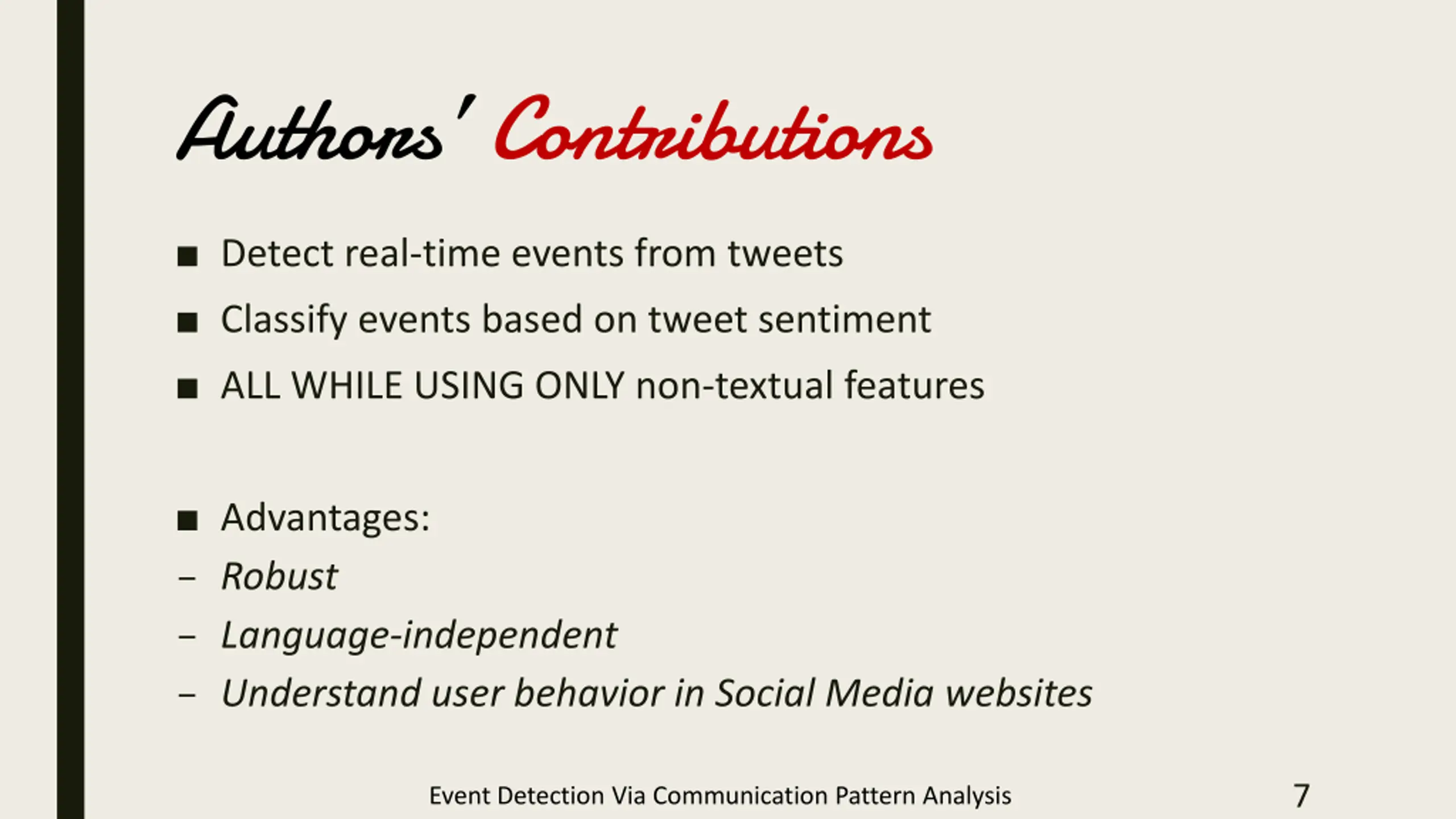 Authors Contributions Detect real-time events from tweets Classify events based on tweet sentiment ALL WHILE USING ONLY non-textual features Advantages: Robust Language-independent Understand user behavior in Social Media websites 7 Event Detection Via Communication Pattern Analysis