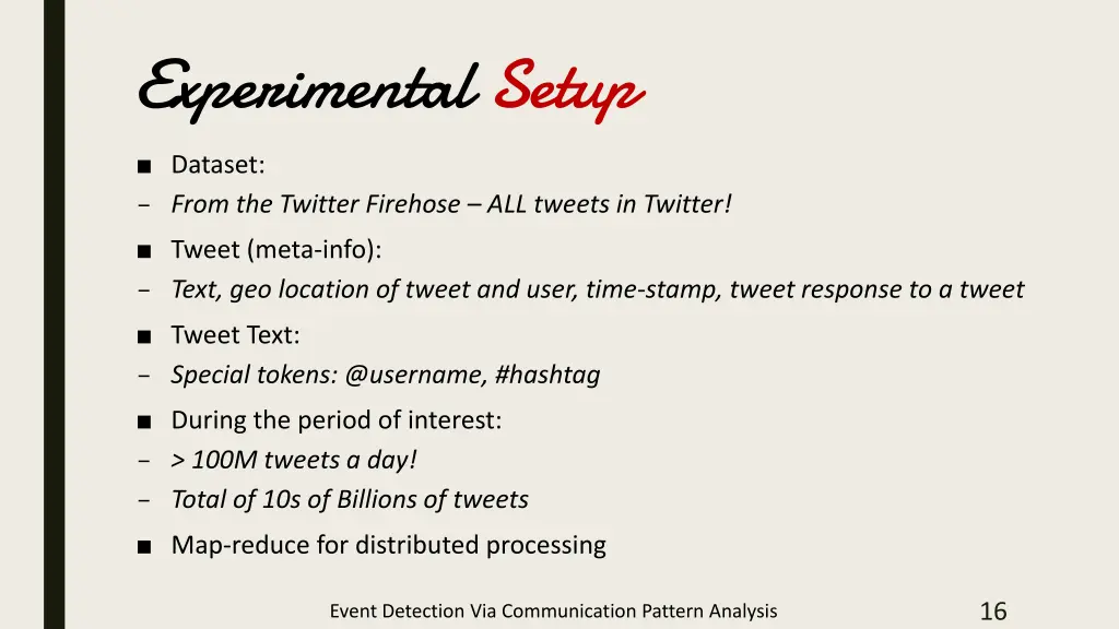 The Model Absence of an unusual event: Every user has the same probability of tweeting/retweeting Occurrence of an unusual event: Each user becomes interested independently by flipping a coin interested user tweet/retweet about event before tweeting anything else This simplistic model naturally produces the heartbeat pattern i.e. generates aggregate behavior observed in temporal vicinity of sub-events Intuitively, interested folks need to tweet new info before becoming able to retweet already-shared info 15 Event Detection Via Communication Pattern Analysis