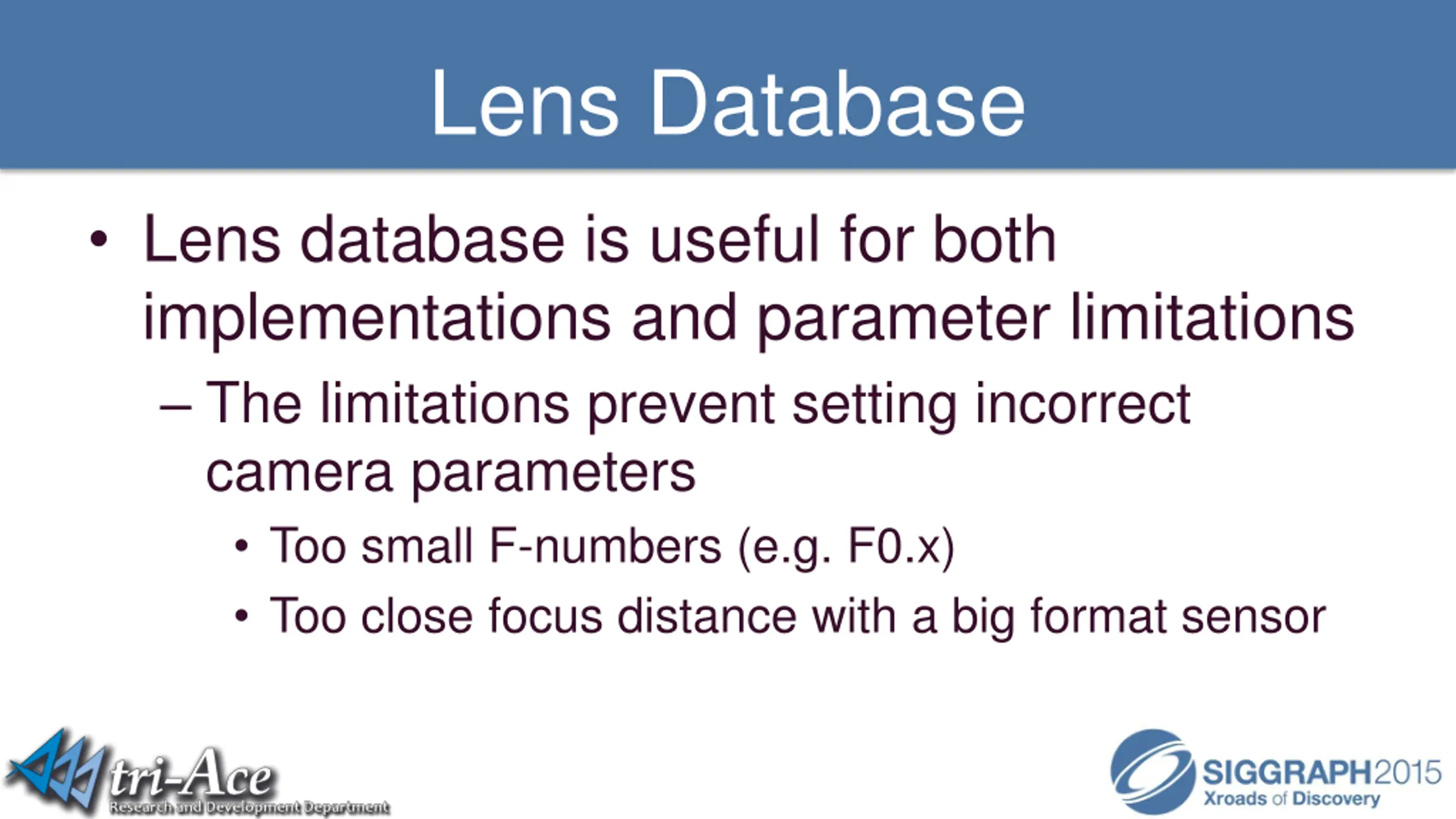 Lens Database Lens database is useful for both implementations and parameter limitations The limitations prevent setting incorrect camera parameters Too small F-numbers (e.g. F0.x) Too close focus distance with a big format sensor