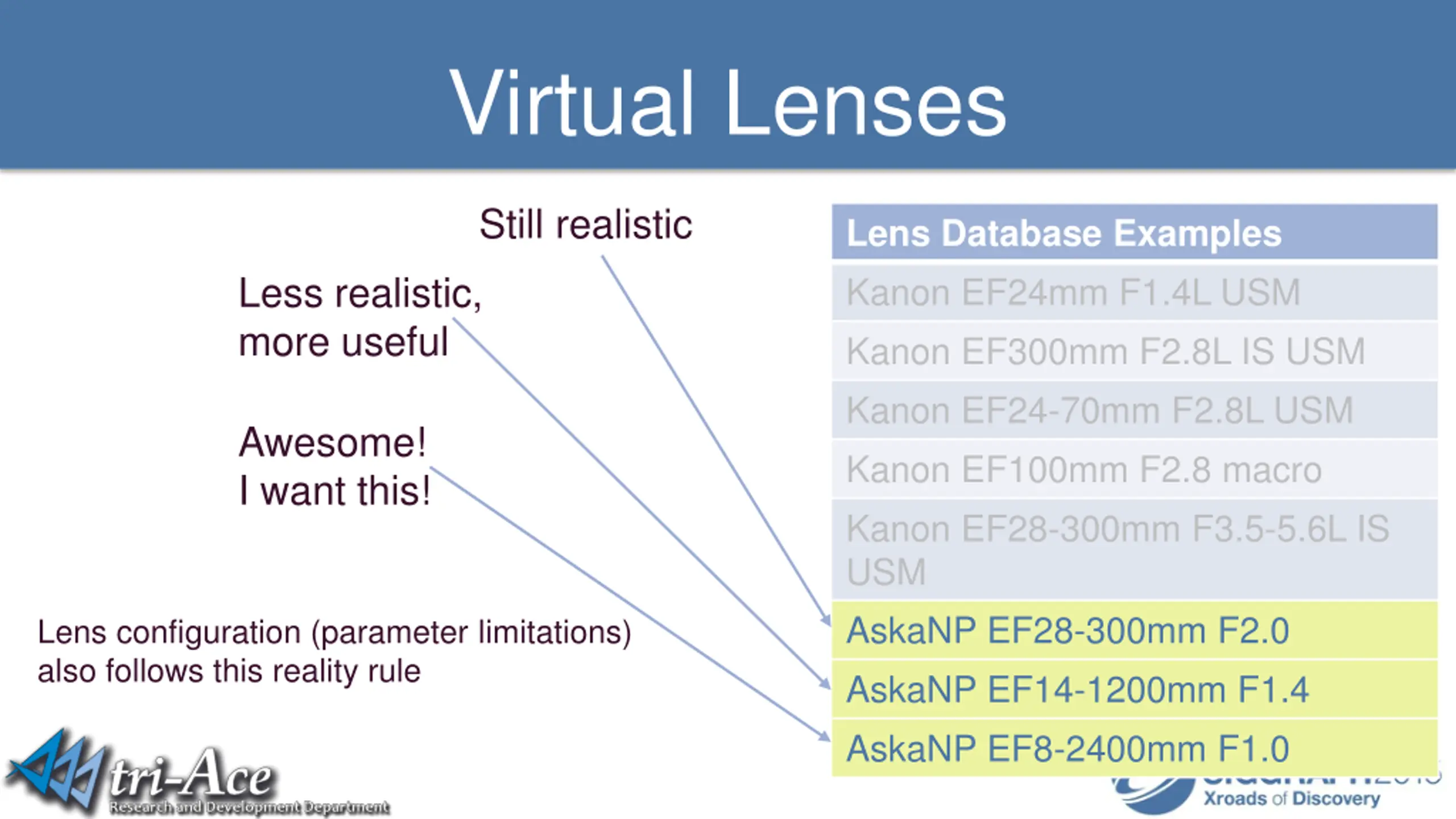 Virtual Lenses Still realistic Lens Database Examples Kanon EF24mm F1.4L USM Kanon EF300mm F2.8L IS USM Kanon EF24-70mm F2.8L USM Kanon EF100mm F2.8 macro Kanon EF28-300mm F3.5-5.6L IS USM AskaNP EF28-300mm F2.0 AskaNP EF14-1200mm F1.4 AskaNP EF8-2400mm F1.0 Less realistic, more useful Awesome! I want this! Lens configuration (parameter limitations) also follows this reality rule