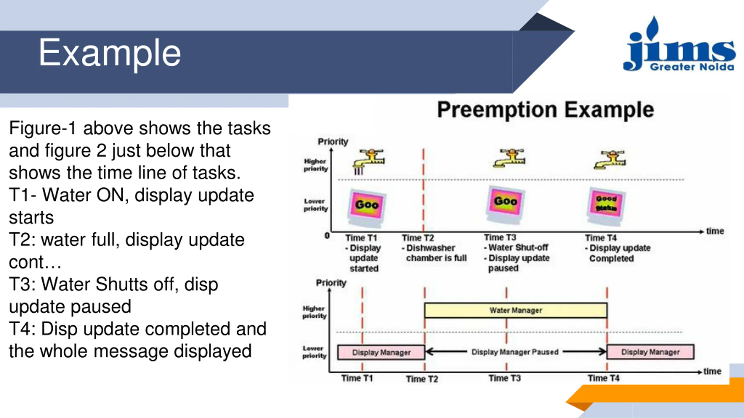 Example Figure-1 above shows the tasks and figure 2 just below that shows the time line of tasks. T1- Water ON, display update starts T2: water full, display update cont T3: Water Shutts off, disp update paused T4: Disp update completed and the whole message displayed