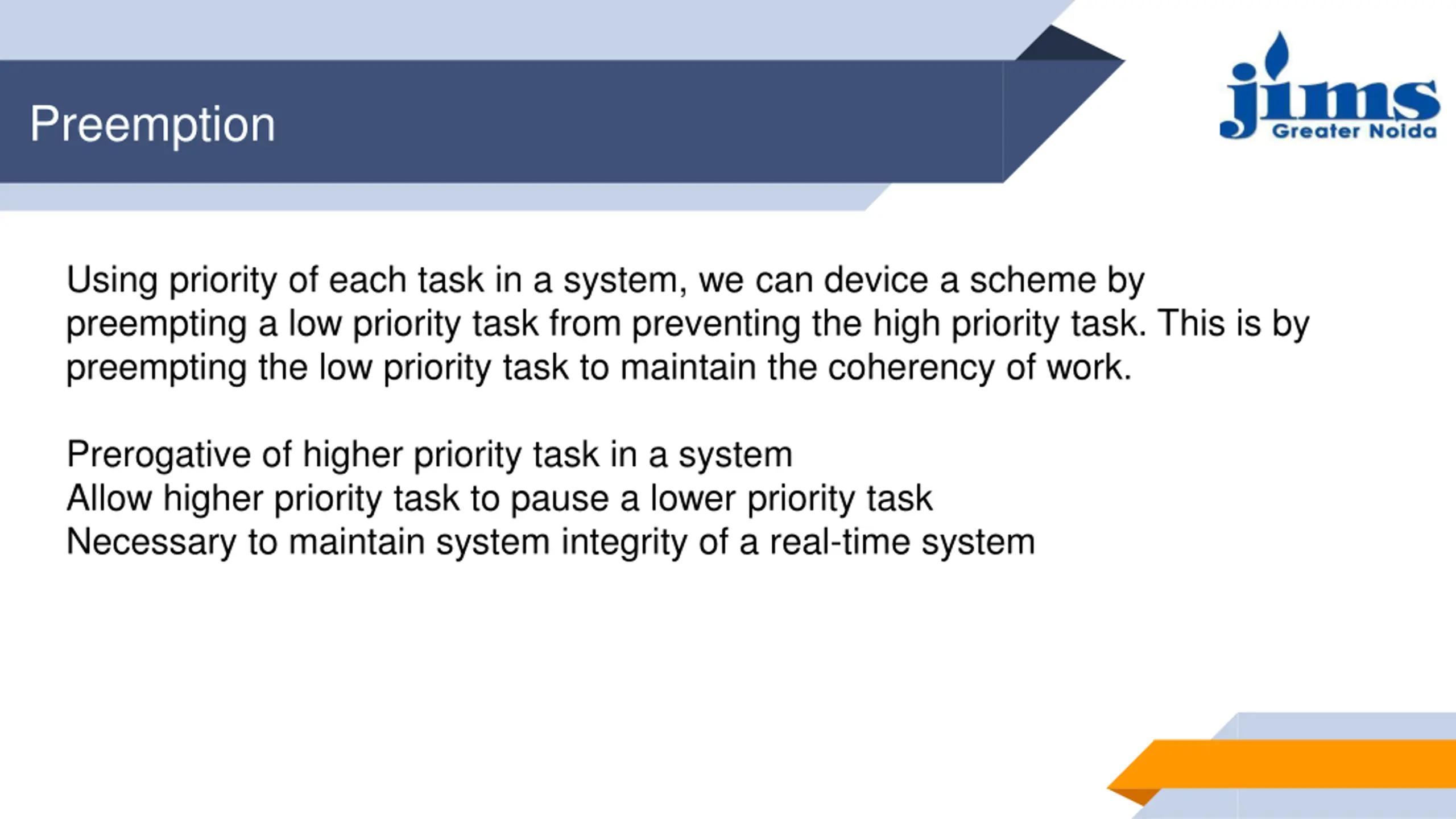 Preemption Using priority of each task in a system, we can device a scheme by preempting a low priority task from preventing the high priority task. This is by preempting the low priority task to maintain the coherency of work. Prerogative of higher priority task in a system Allow higher priority task to pause a lower priority task Necessary to maintain system integrity of a real-time system