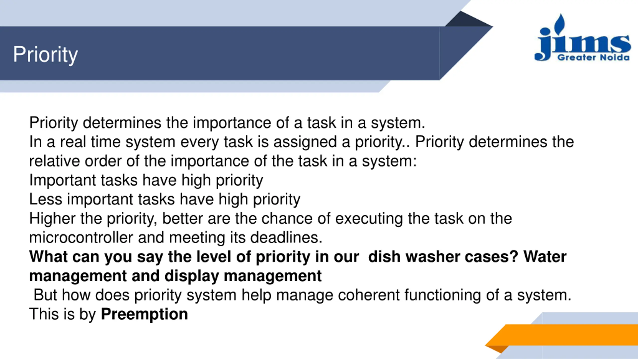 Priority Priority determines the importance of a task in a system. In a real time system every task is assigned a priority.. Priority determines the relative order of the importance of the task in a system: Important tasks have high priority Less important tasks have high priority Higher the priority, better are the chance of executing the task on the microcontroller and meeting its deadlines. What can you say the level of priority in our dish washer cases? Water management and display management But how does priority system help manage coherent functioning of a system. This is by Preemption