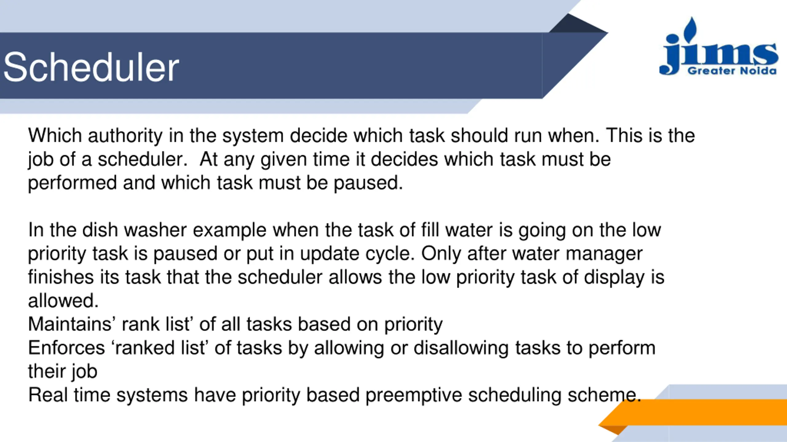 Scheduler Which authority in the system decide which task should run when. This is the job of a scheduler. At any given time it decides which task must be performed and which task must be paused. In the dish washer example when the task of fill water is going on the low priority task is paused or put in update cycle. Only after water manager finishes its task that the scheduler allows the low priority task of display is allowed. Maintains rank list of all tasks based on priority Enforces ranked list of tasks by allowing or disallowing tasks to perform their job Real time systems have priority based preemptive scheduling scheme.