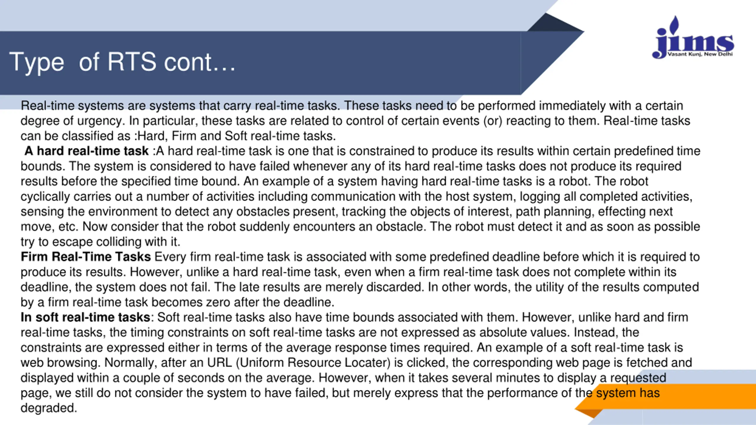 Type of RTS cont Real-time systems are systems that carry real-time tasks. These tasks need to be performed immediately with a certain degree of urgency. In particular, these tasks are related to control of certain events (or) reacting to them. Real-time tasks can be classified as :Hard, Firm and Soft real-time tasks. A hard real-time task :A hard real-time task is one that is constrained to produce its results within certain predefined time bounds. The system is considered to have failed whenever any of its hard real-time tasks does not produce its required results before the specified time bound. An example of a system having hard real-time tasks is a robot. The robot cyclically carries out a number of activities including communication with the host system, logging all completed activities, sensing the environment to detect any obstacles present, tracking the objects of interest, path planning, effecting next move, etc. Now consider that the robot suddenly encounters an obstacle. The robot must detect it and as soon as possible try to escape colliding with it. Firm Real-Time Tasks Every firm real-time task is associated with some predefined deadline before which it is required to produce its results. However, unlike a hard real-time task, even when a firm real-time task does not complete within its deadline, the system does not fail. The late results are merely discarded. In other words, the utility of the results computed by a firm real-time task becomes zero after the deadline. In soft real-time tasks: Soft real-time tasks also have time bounds associated with them. However, unlike hard and firm real-time tasks, the timing constraints on soft real-time tasks are not expressed as absolute values. Instead, the constraints are expressed either in terms of the average response times required. An example of a soft real-time task is web browsing. Normally, after an URL (Uniform Resource Locater) is clicked, the corresponding web page is fetched and displayed within a couple of seconds on the average. However, when it takes several minutes to display a requested page, we still do not consider the system to have failed, but merely express that the performance of the system has degraded.