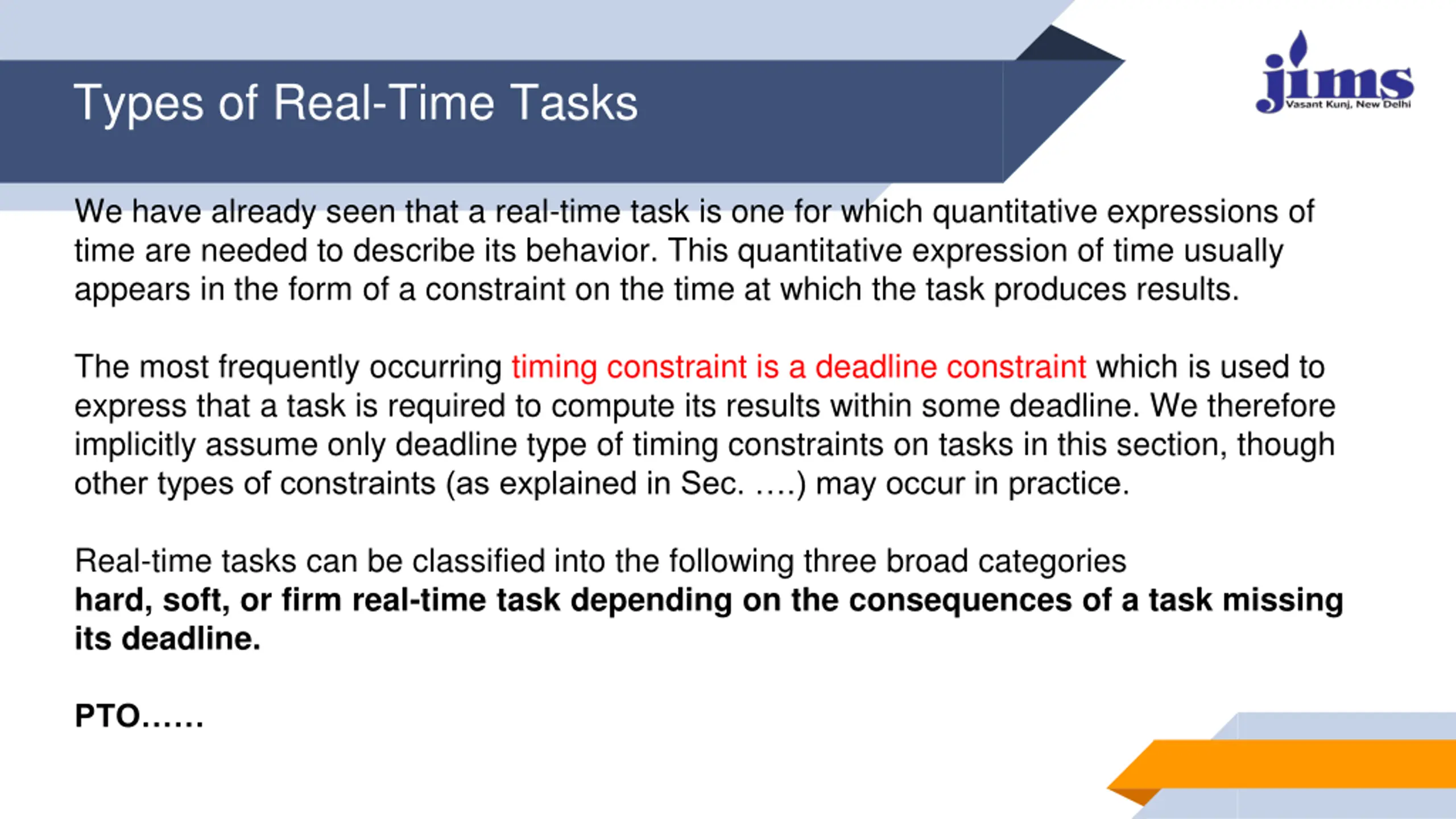 Types of Real-Time Tasks We have already seen that a real-time task is one for which quantitative expressions of time are needed to describe its behavior. This quantitative expression of time usually appears in the form of a constraint on the time at which the task produces results. The most frequently occurring timing constraint is a deadline constraint which is used to express that a task is required to compute its results within some deadline. We therefore implicitly assume only deadline type of timing constraints on tasks in this section, though other types of constraints (as explained in Sec. .) may occur in practice. Real-time tasks can be classified into the following three broad categories hard, soft, or firm real-time task depending on the consequences of a task missing its deadline. PTO
