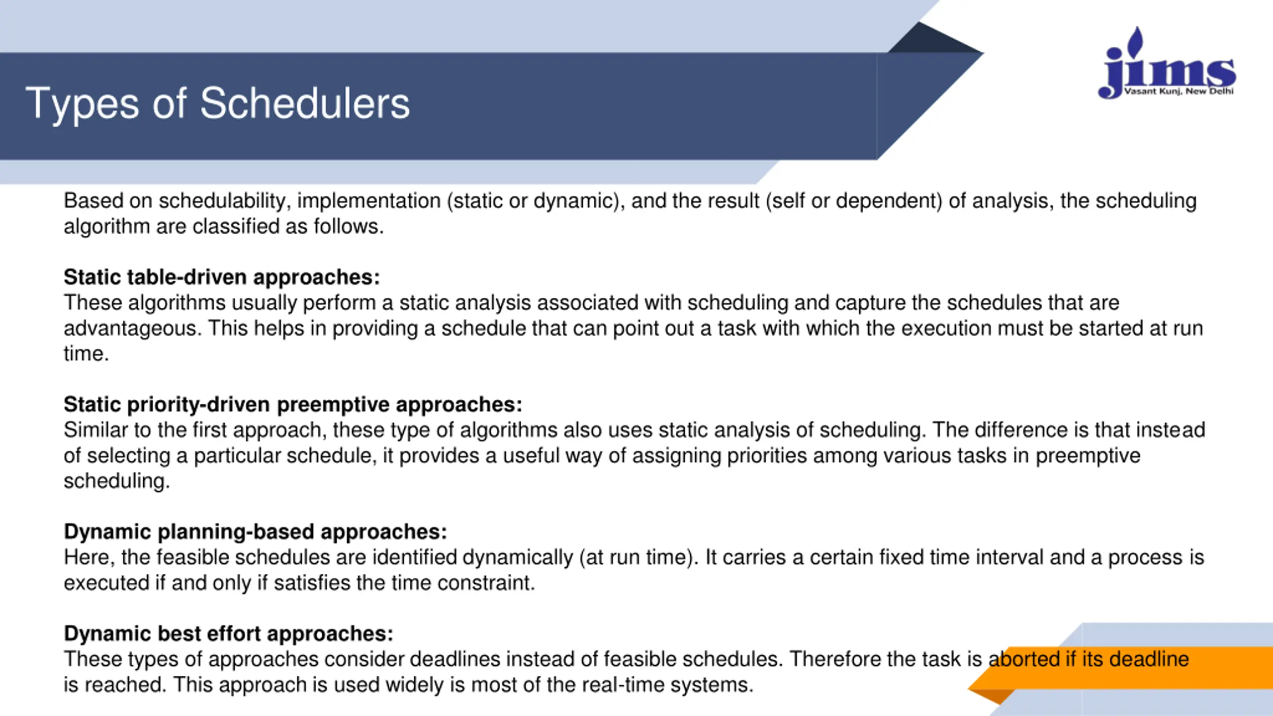 Types of Schedulers Based on schedulability, implementation (static or dynamic), and the result (self or dependent) of analysis, the scheduling algorithm are classified as follows. Static table-driven approaches: These algorithms usually perform a static analysis associated with scheduling and capture the schedules that are advantageous. This helps in providing a schedule that can point out a task with which the execution must be started at run time. Static priority-driven preemptive approaches: Similar to the first approach, these type of algorithms also uses static analysis of scheduling. The difference is that instead of selecting a particular schedule, it provides a useful way of assigning priorities among various tasks in preemptive scheduling. Dynamic planning-based approaches: Here, the feasible schedules are identified dynamically (at run time). It carries a certain fixed time interval and a process is executed if and only if satisfies the time constraint. Dynamic best effort approaches: These types of approaches consider deadlines instead of feasible schedules. Therefore the task is aborted if its deadline is reached. This approach is used widely is most of the real-time systems.
