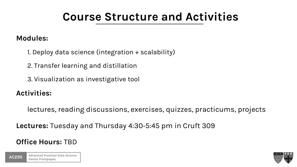 Course Structure and Activities Modules: 1. Deploy data science (integration + scalability) 2. Transfer learning and distillation 3. Visualization as investigative tool Activities: lectures, reading discussions, exercises, quizzes, practicums, projects Lectures: Tuesday and Thursday 4:30 5:45 pm in Cruft 309 Office Hours: TBD Advanced Practical Data Science Pavlos Protopapas AC295