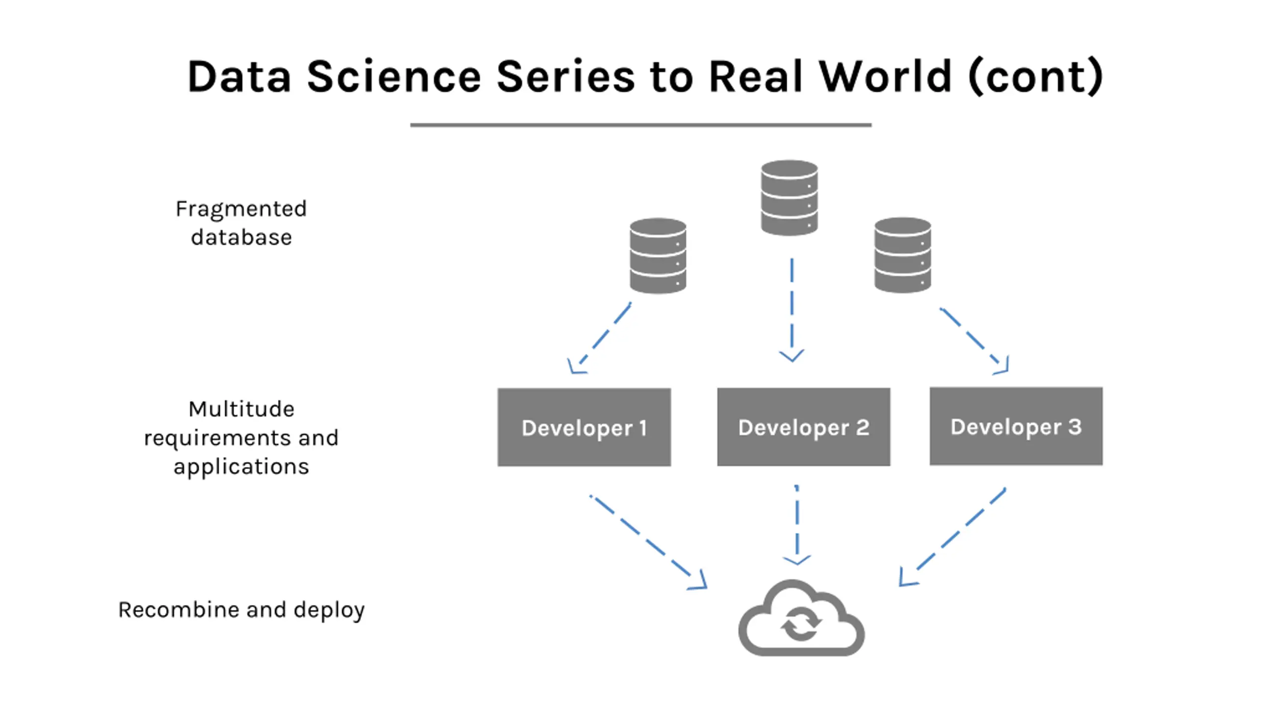Data Science Series to Real World (cont) Fragmented database Multitude requirements and applications Developer 3 Developer 2 Developer 1 Recombine and deploy