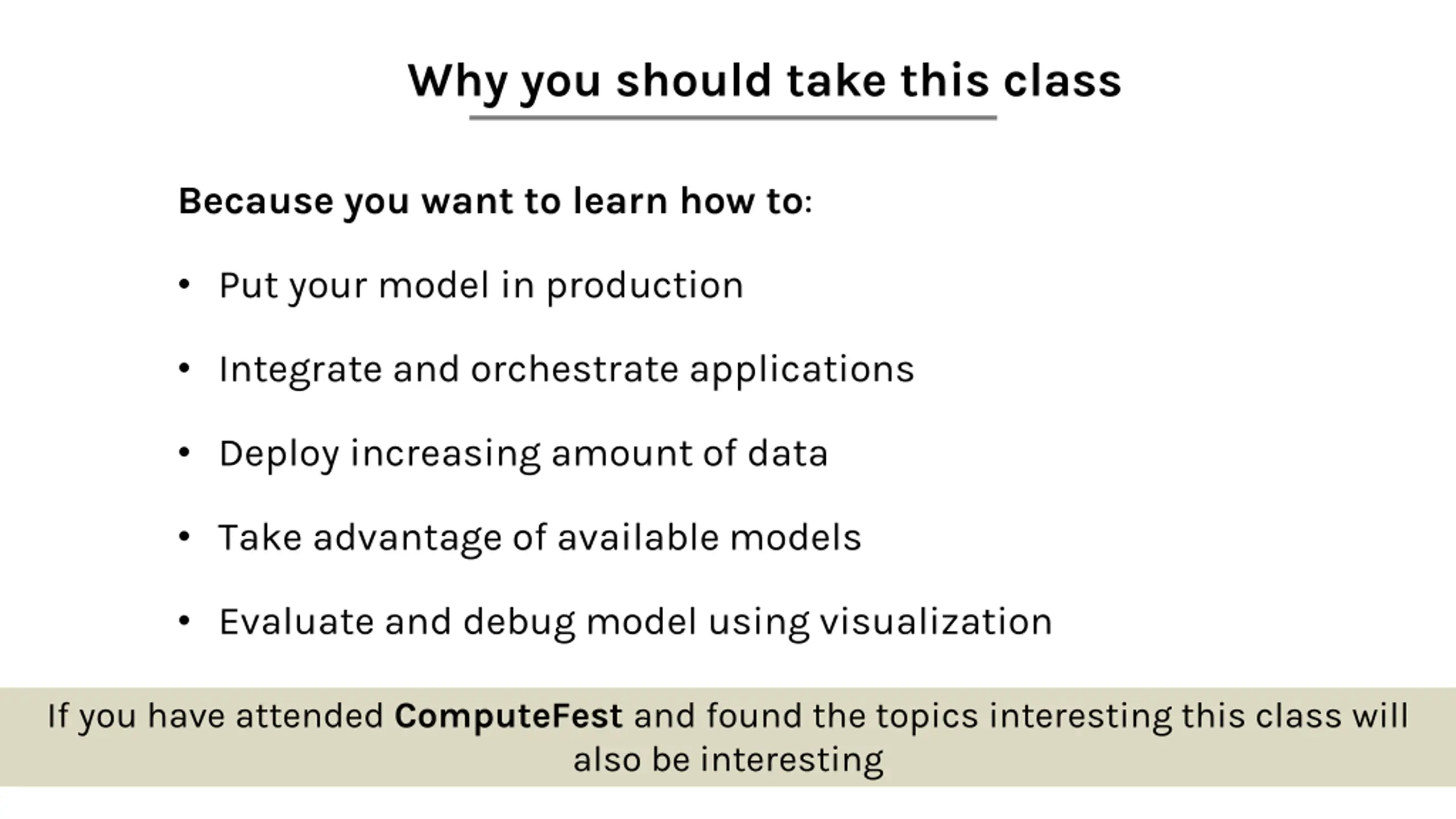 Why you should take this class Because you want to learn how to: Put your model in production Integrate and orchestrate applications Deploy increasing amount of data Take advantage of available models Evaluate and debug model using visualization If you have attended ComputeFest and found the topics interesting this class will also be interesting