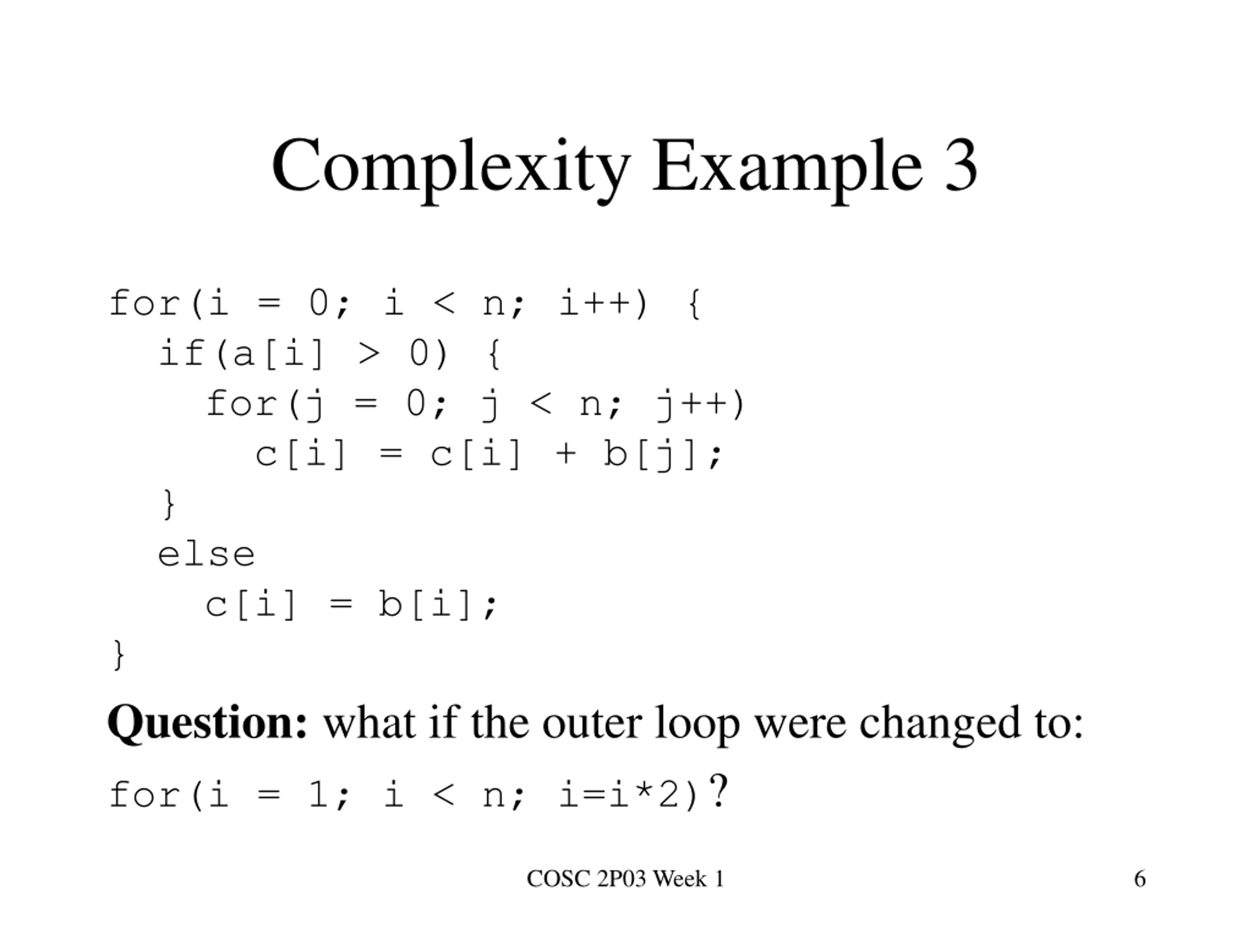 Complexity Example 3 for(i = 0; i < n; i++) { if(a[i] > 0) { for(j = 0; j < n; j++) c[i] = c[i] + b[j]; } else c[i] = b[i]; } Question: what if the outer loop were changed to: for(i = 1; i < n; i=i*2)? COSC 2P03 Week 1 6