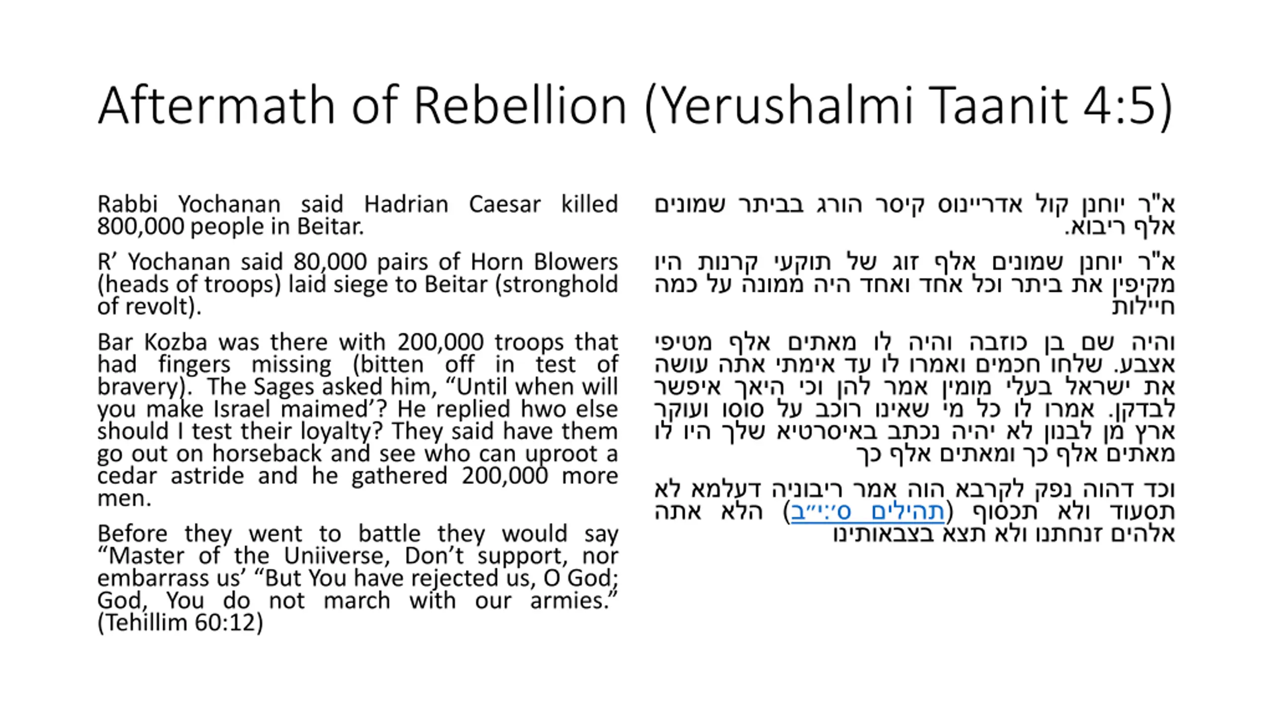 Aftermath of Rebellion (Yerushalmi Taanit 4:5) " " . ( . Rabbi Yochanan said Hadrian Caesar killed 800,000people in Beitar. R Yochanan said 80,000 pairs of Horn Blowers (heads of troops) laid siege to Beitar (stronghold of revolt). Bar Kozba was there with 200,000 troops that had fingers missing (bitten off in test of bravery). The Sages asked him, Until when will you make Israel maimed ? He replied hwo else should I test their loyalty? They said have them go out on horseback and see who can uproot a cedar astride and he gathered 200,000 more men. Before they went to battle they would say Master of the Uniiverse, Don t support, nor embarrass us But You have rejected us, O God; God, You do not march with our armies. (Tehillim 60:12) . ) :