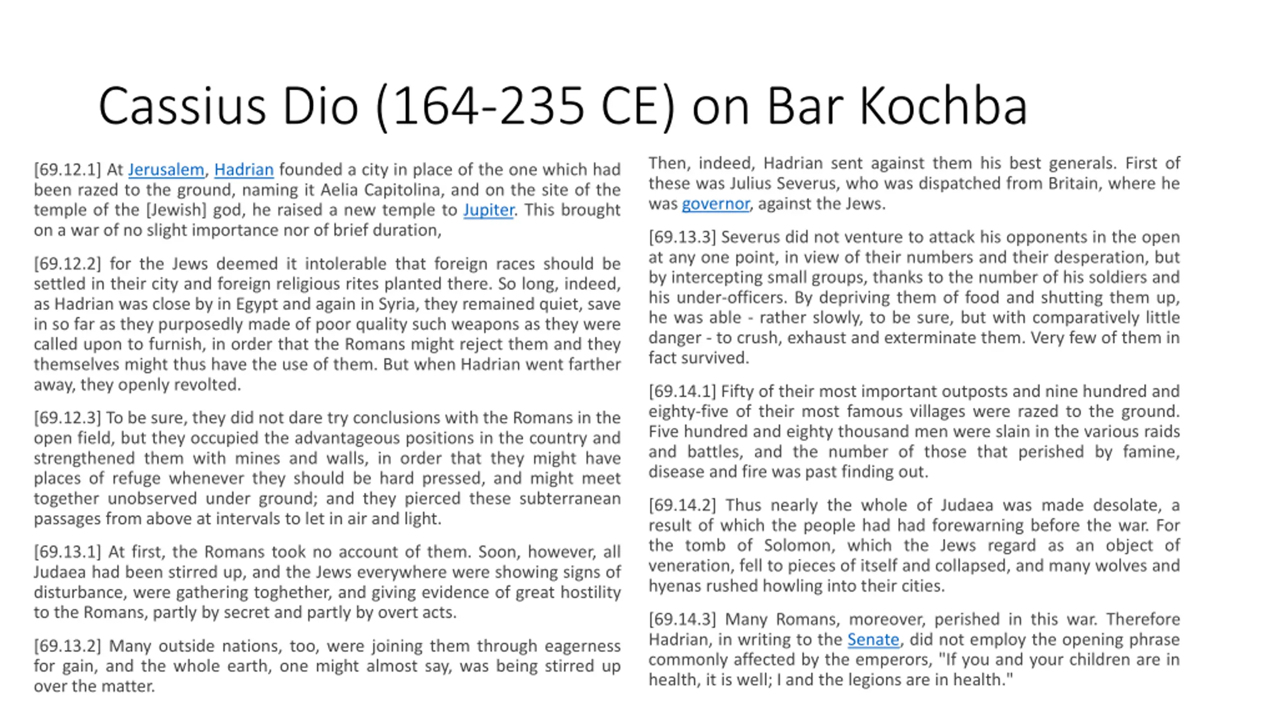 Cassius Dio (164-235 CE) on Bar Kochba Then, indeed, Hadrian sent against them his best generals. First of these was Julius Severus, who was dispatched from Britain, where he was governor, against the Jews. [69.12.1] At Jerusalem, Hadrian founded a city in place of the one which had been razed to the ground, naming it Aelia Capitolina, and on the site of the temple of the [Jewish] god, he raised a new temple to Jupiter. This brought on a war of no slight importance nor of brief duration, [69.13.3] Severus did not venture to attack his opponents in the open at any one point, in view of their numbers and their desperation, but by intercepting small groups, thanks to the number of his soldiers and his under-officers. By depriving them of food and shutting them up, he was able - rather slowly, to be sure, but with comparatively little danger - to crush, exhaust and exterminate them. Very few of them in fact survived. [69.12.2] for the Jews deemed it intolerable that foreign races should be settled in their city and foreign religious rites planted there. So long, indeed, as Hadrian was close by in Egypt and again in Syria, they remained quiet, save in so far as they purposedly made of poor quality such weapons as they were called upon to furnish, in order that the Romans might reject them and they themselves might thus have the use of them. But when Hadrian went farther away, they openly revolted. [69.14.1] Fifty of their most important outposts and nine hundred and eighty-five of their most famous villages were razed to the ground. Five hundred and eighty thousand men were slain in the various raids and battles, and the number of those that perished by famine, disease and fire was past finding out. [69.12.3] To be sure, they did not dare try conclusions with the Romans in the open field, but they occupied the advantageous positions in the country and strengthened them with mines and walls, in order that they might have places of refuge whenever they should be hard pressed, and might meet together unobserved under ground; and they pierced these subterranean passages from above at intervals to let in air and light. [69.14.2] Thus nearly the whole of Judaea was made desolate, a result of which the people had had forewarning before the war. For the tomb of Solomon, which the Jews regard as an object of veneration, fell to pieces of itself and collapsed, and many wolves and hyenas rushed howling into their cities. [69.13.1] At first, the Romans took no account of them. Soon, however, all Judaea had been stirred up, and the Jews everywhere were showing signs of disturbance, were gathering toghether, and giving evidence of great hostility to the Romans, partly by secret and partly by overt acts. [69.14.3] Many Romans, moreover, perished in this war. Therefore Hadrian, in writing to the Senate, did not employ the opening phrase commonly affected by the emperors, "If you and your children are in health, it is well; I and the legions are in health." [69.13.2] Many outside nations, too, were joining them through eagerness for gain, and the whole earth, one might almost say, was being stirred up over the matter.
