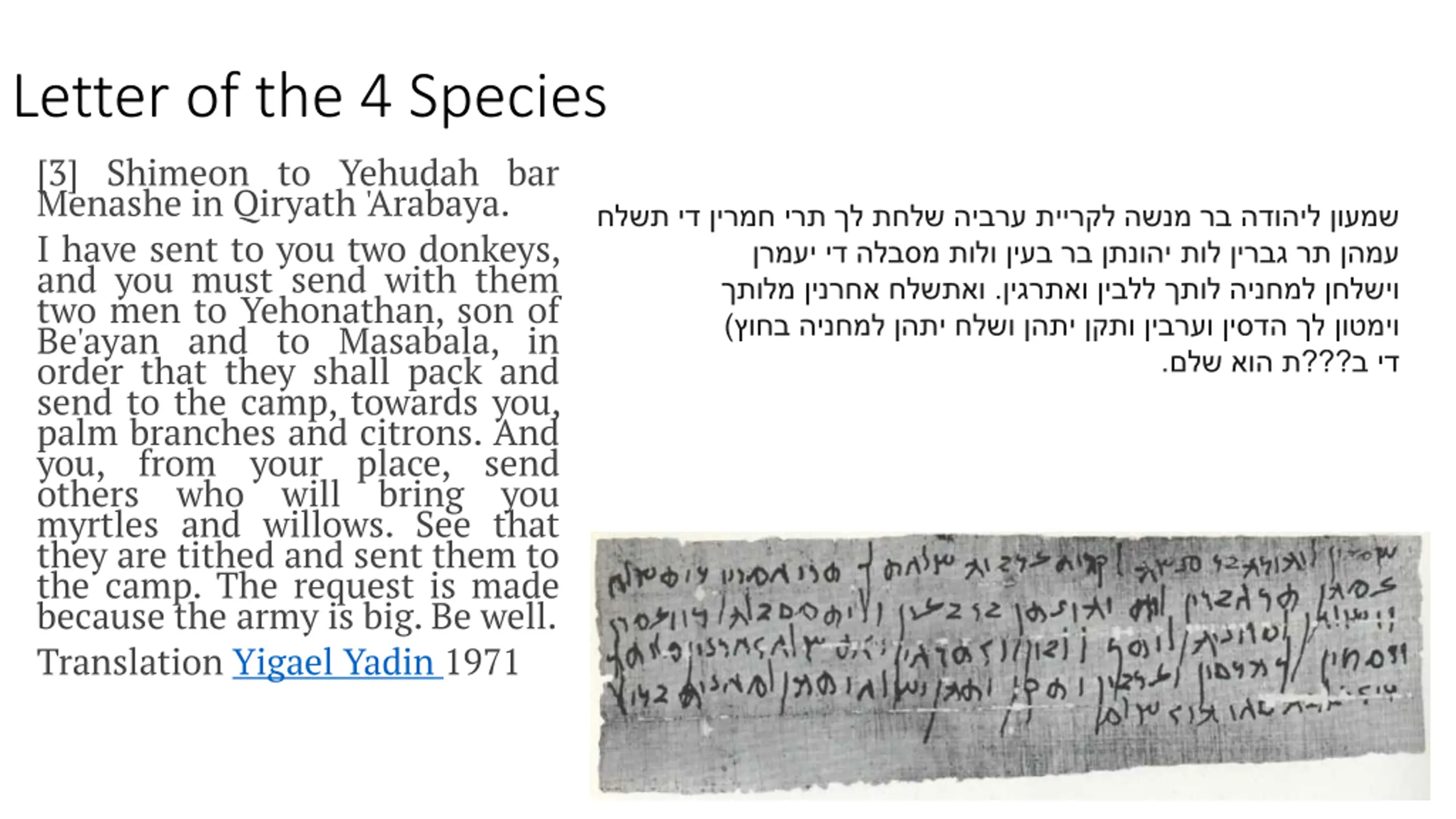 Letter of the 4 Species [3] Shimeon to Yehudah bar Menashe in Qiryath 'Arabaya. I have sent to you two donkeys, and you must send with them two men to Yehonathan, son of Be'ayan and to Masabala, in order that they shall pack and send to the camp, towards you, palm branches and citrons. And you, from your others who will myrtles and willows. See that they are tithed and sent them to the camp. The request is made because the army is big. Be well. Translation Yigael Yadin 1971 . ) ??? . place, send bring you