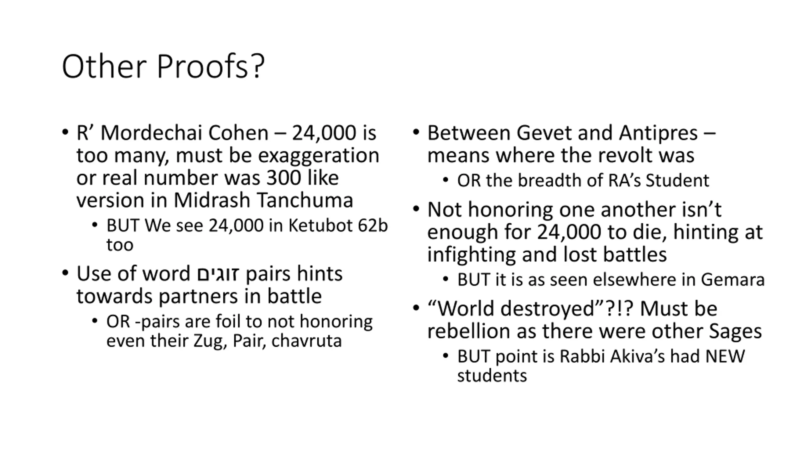 Other Proofs? R Mordechai Cohen 24,000 is too many, must be exaggeration or real number was 300 like version in Midrash Tanchuma BUT We see 24,000 in Ketubot 62b too Use of word pairs hints towards partners in battle OR -pairs are foil to not honoring even their Zug, Pair, chavruta Between Gevet and Antipres means where the revolt was OR the breadth of RA s Student Not honoring one another isn t enough for 24,000 to die, hinting at infighting and lost battles BUT it is as seen elsewhere in Gemara World destroyed ?!? Must be rebellion as there were other Sages BUT point is Rabbi Akiva s had NEW students