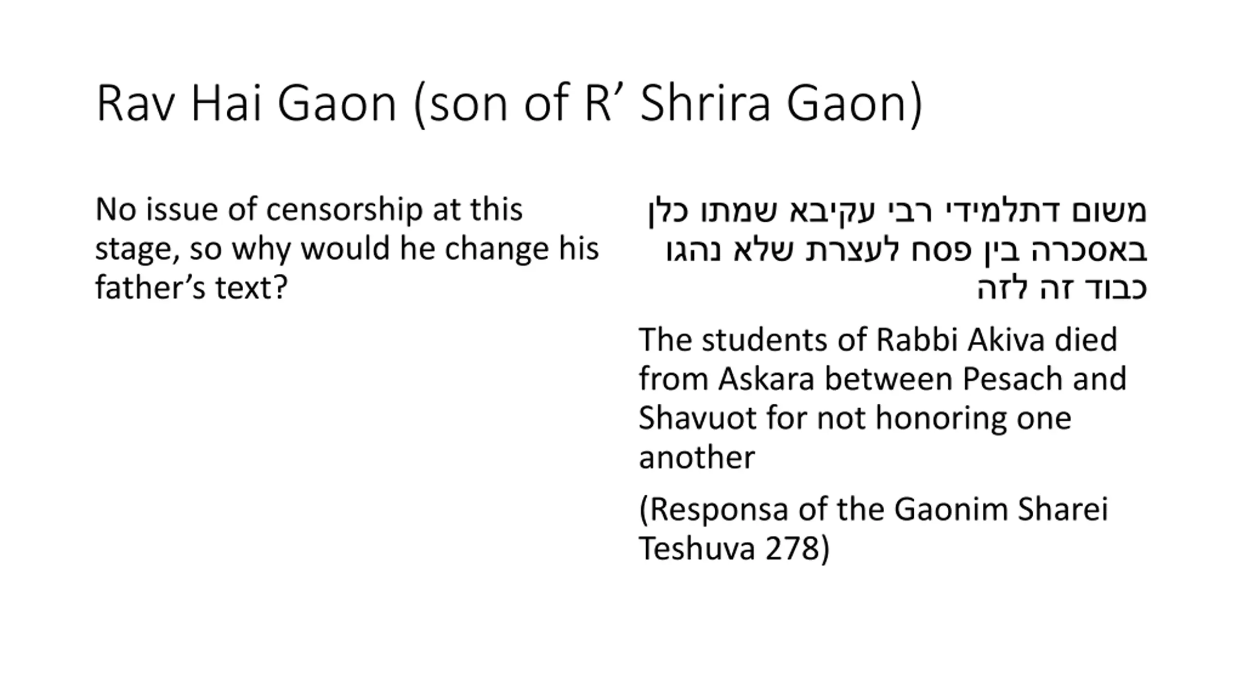 Rav Hai Gaon (son of R Shrira Gaon) No issue of censorship at this stage, so why would he change his father s text? The students of Rabbi Akiva died from Askara between Pesach and Shavuot for not honoring one another (Responsa of the Gaonim Sharei Teshuva 278)